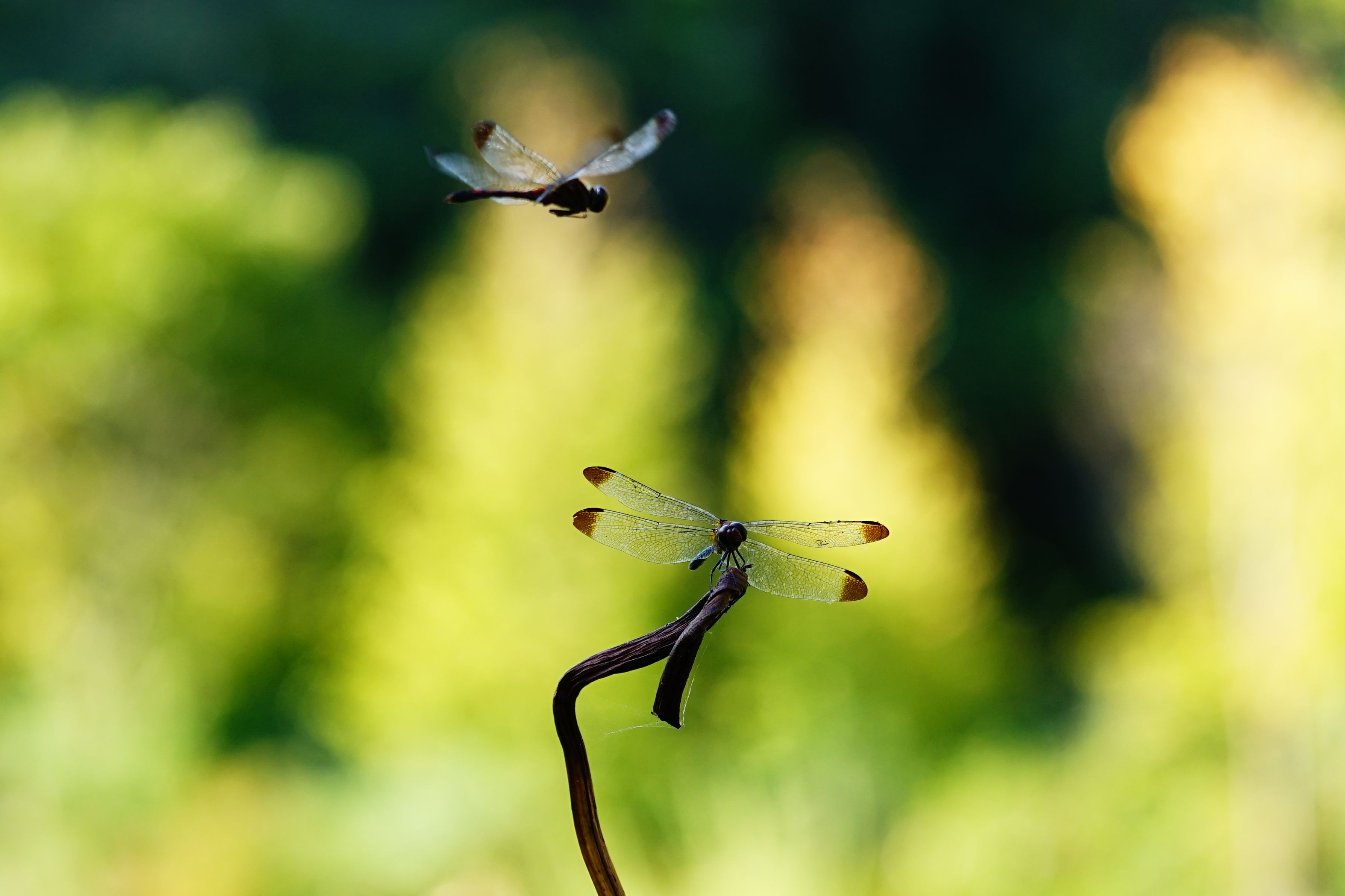 背景は、イチョウが色付いてきました。 トンボの色も濃くなって(成熟して)、穏やかな秋空の下元気良く飛び交っています。 写真はノシメトンボでしょうか・・・