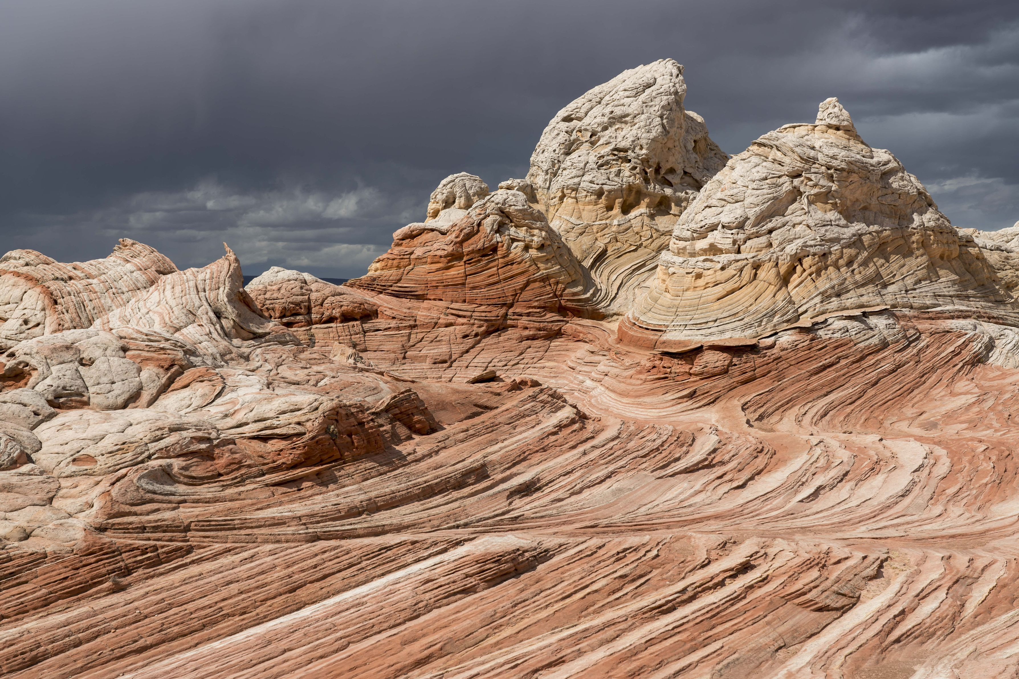 アメリカ、アリゾナ州ホワイトポケット で。 地中でドロドロにミックスされた地層が地殻変動で地表に出てこうなったようです。 ウェーブと違い出入り制限はされていませんが、波模様は地球の作った宝と思いました。