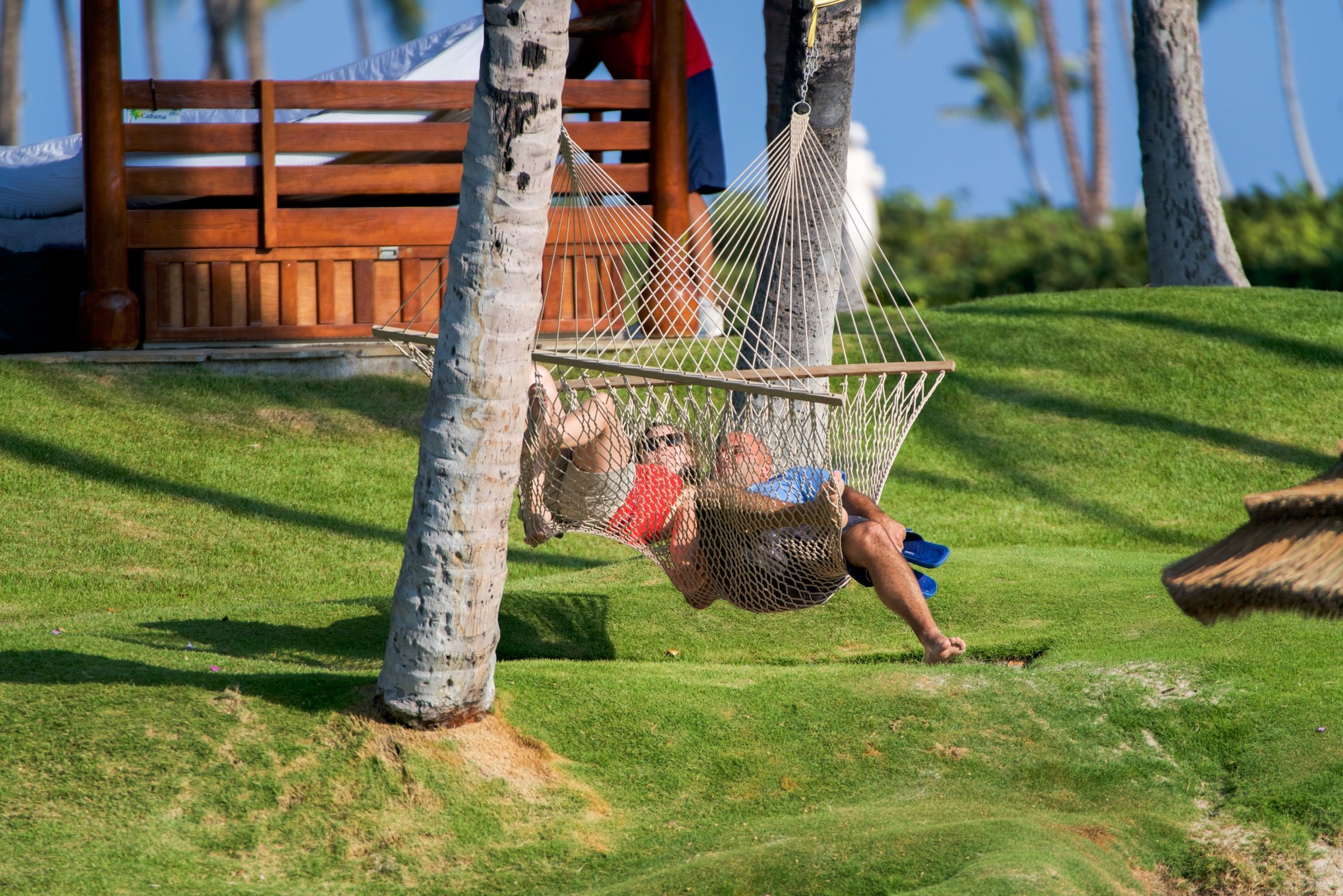 ハワイ島ヒルトンワイコロアヴィレッジにて、敷地内ハンモックで寛ぐ2人。 リゾートを満喫していました。