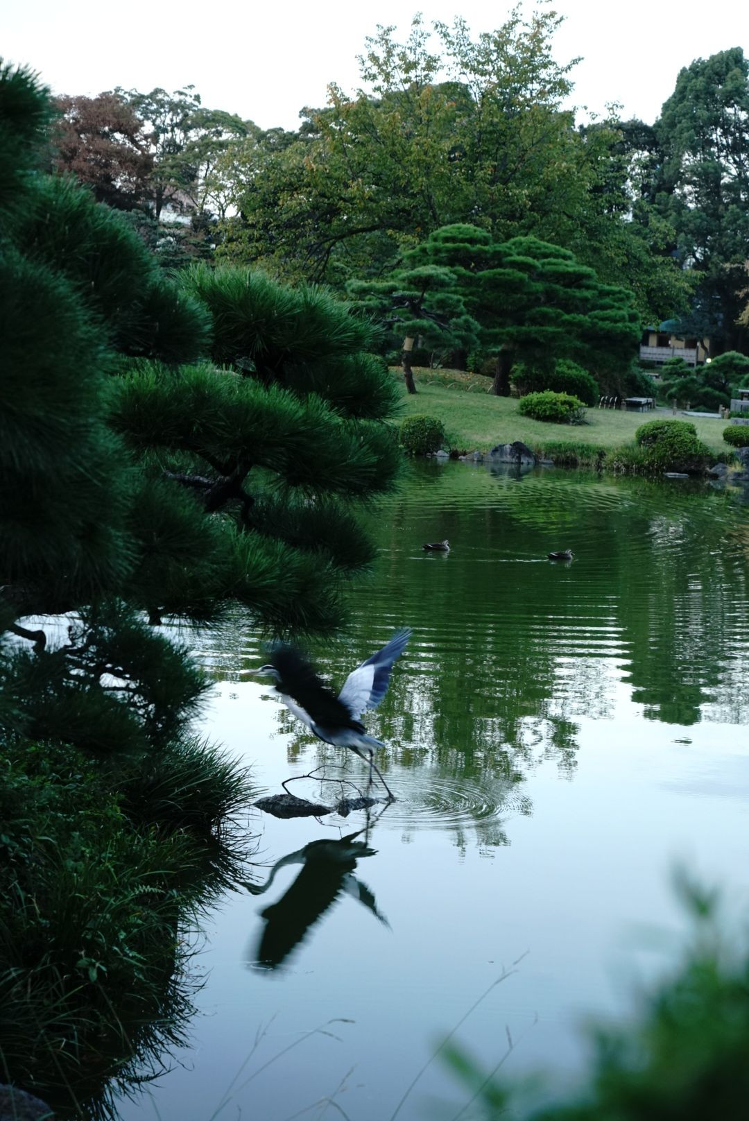 池をスイスイ泳ぐ鳥もいれば、飛び立つ鳥もいました。