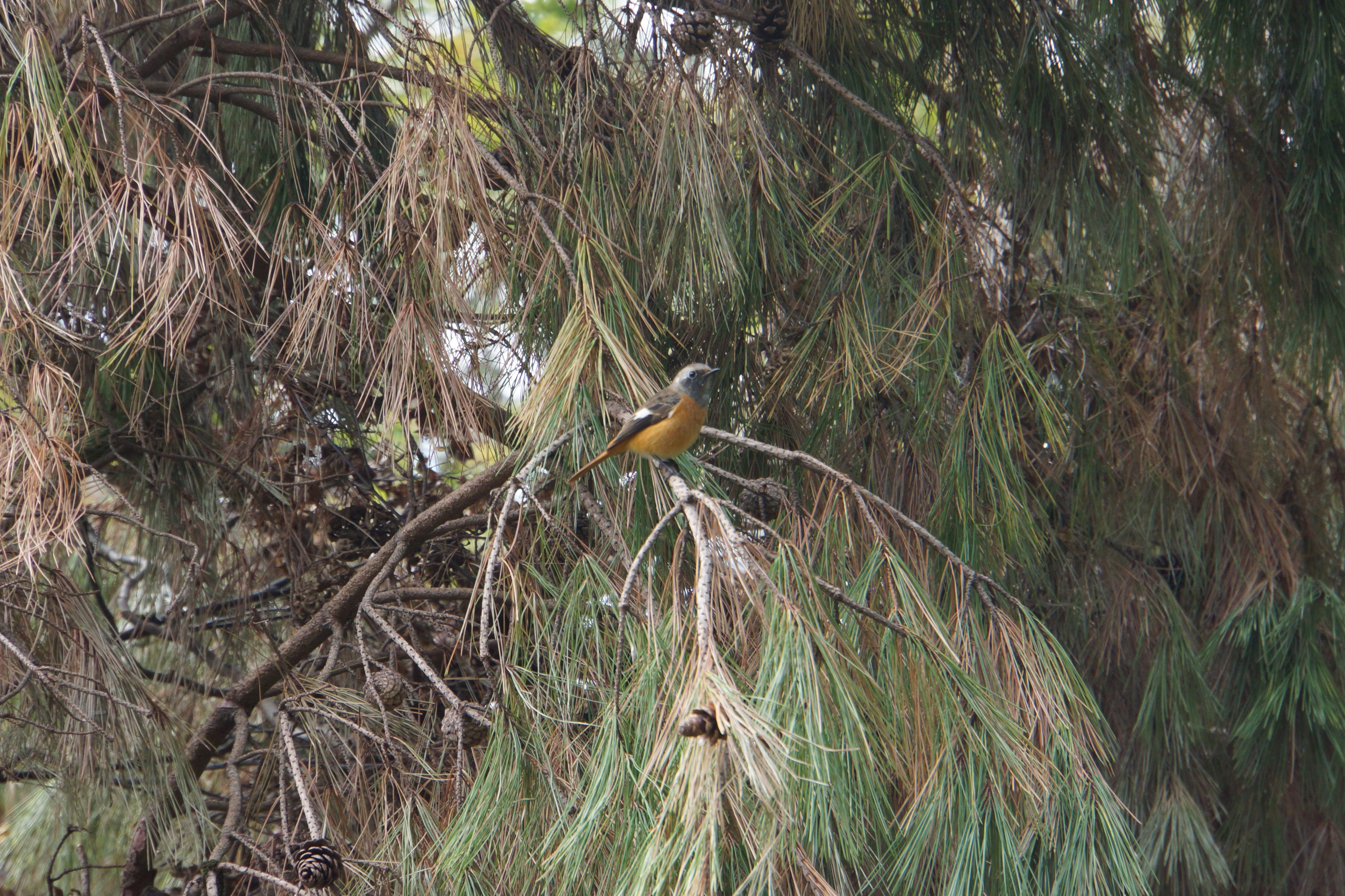 松の木の枝に止まるジョンビタキのオス