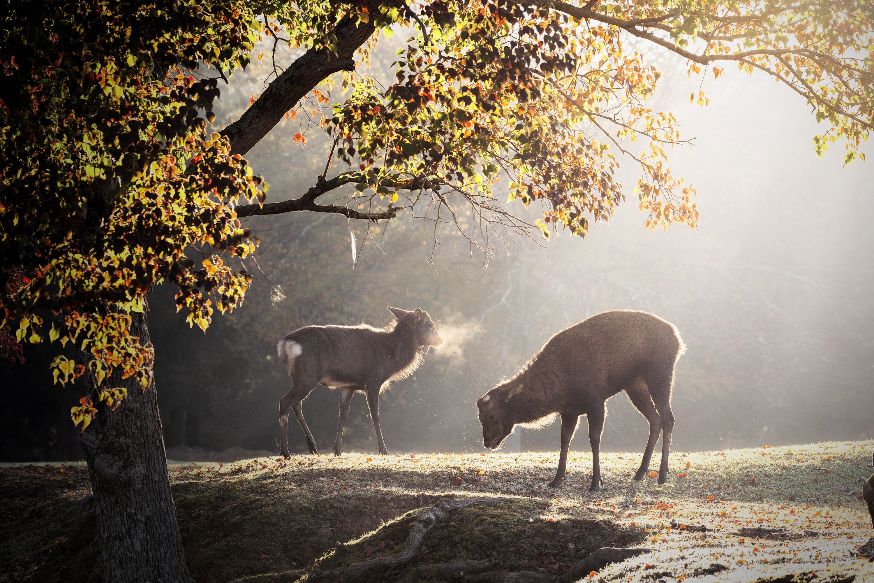 鹿の吐く息と、発情期特有のたてがみの様な毛が朝日に輝いていました。