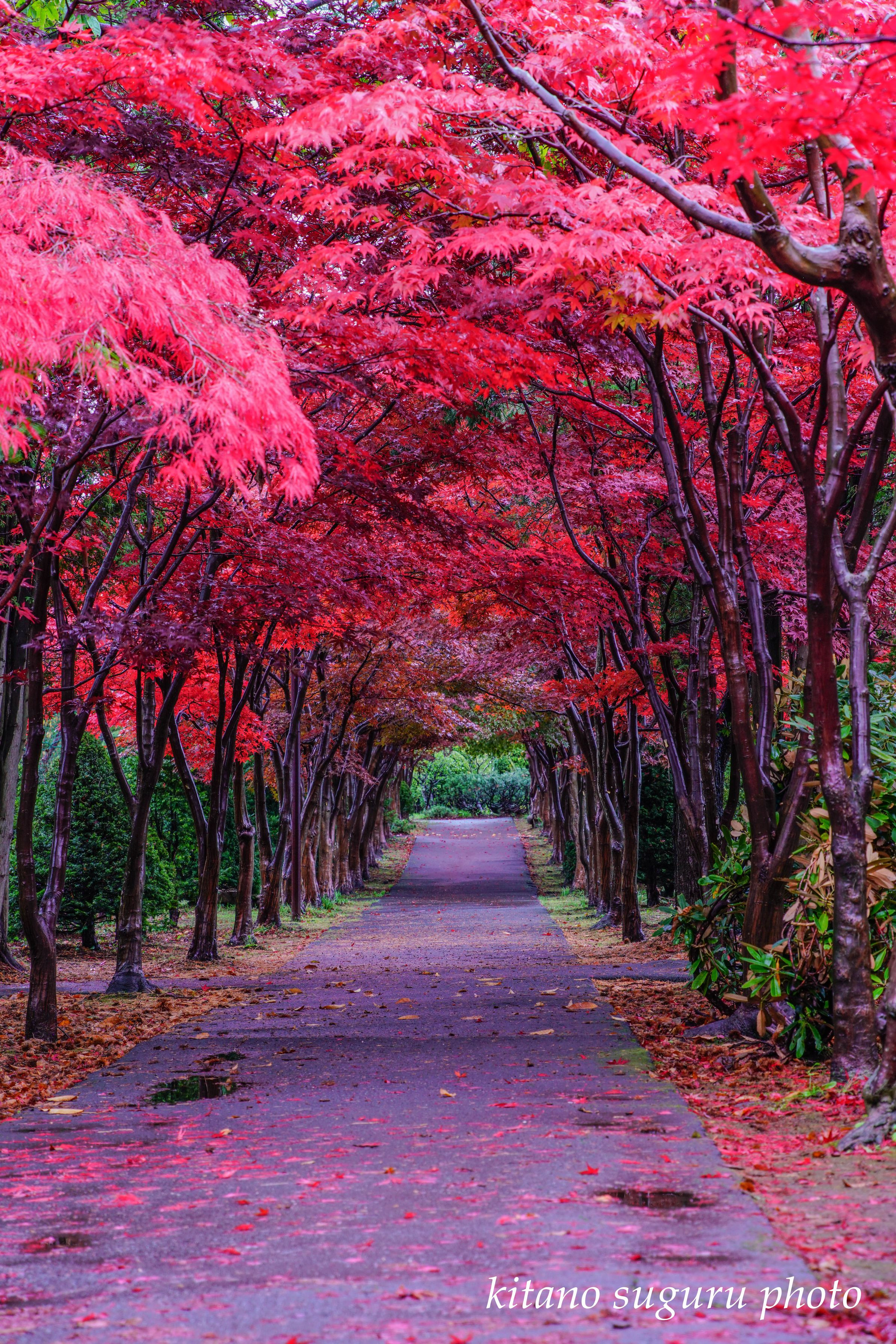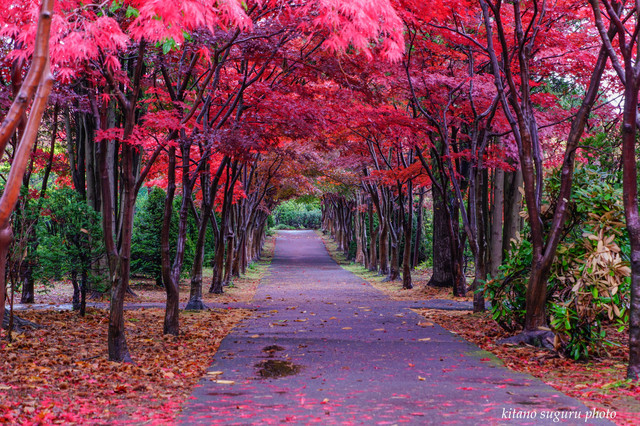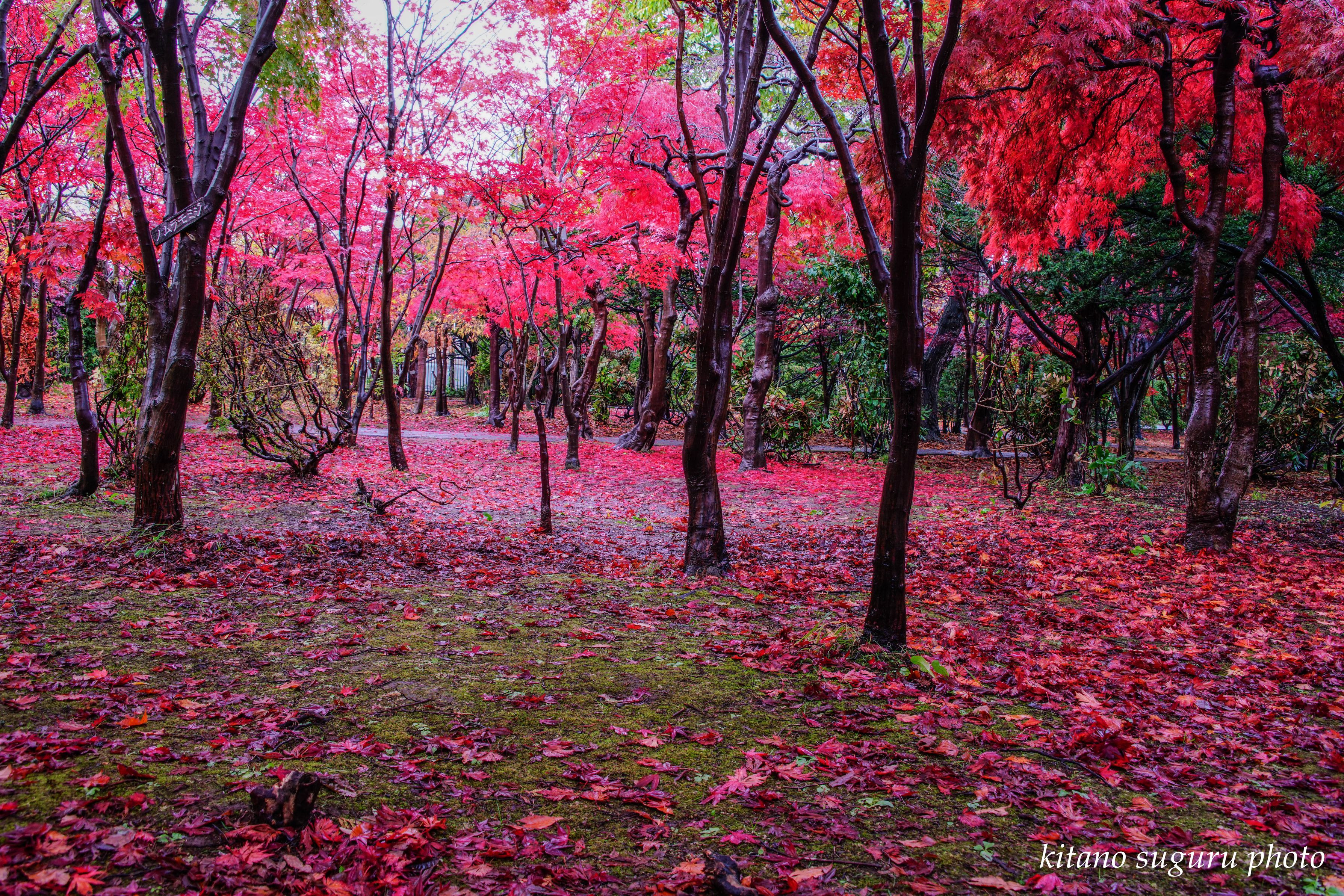 やっと平岡樹芸センターの紅葉も見頃になりました。 昨日の風にとばされたかなと心配しましたが、大丈夫でした。 今週末が最高ですよ。是非行って見てください。 今回は雨の中と夕暮れ時の撮影で落葉と色が今一つでした。