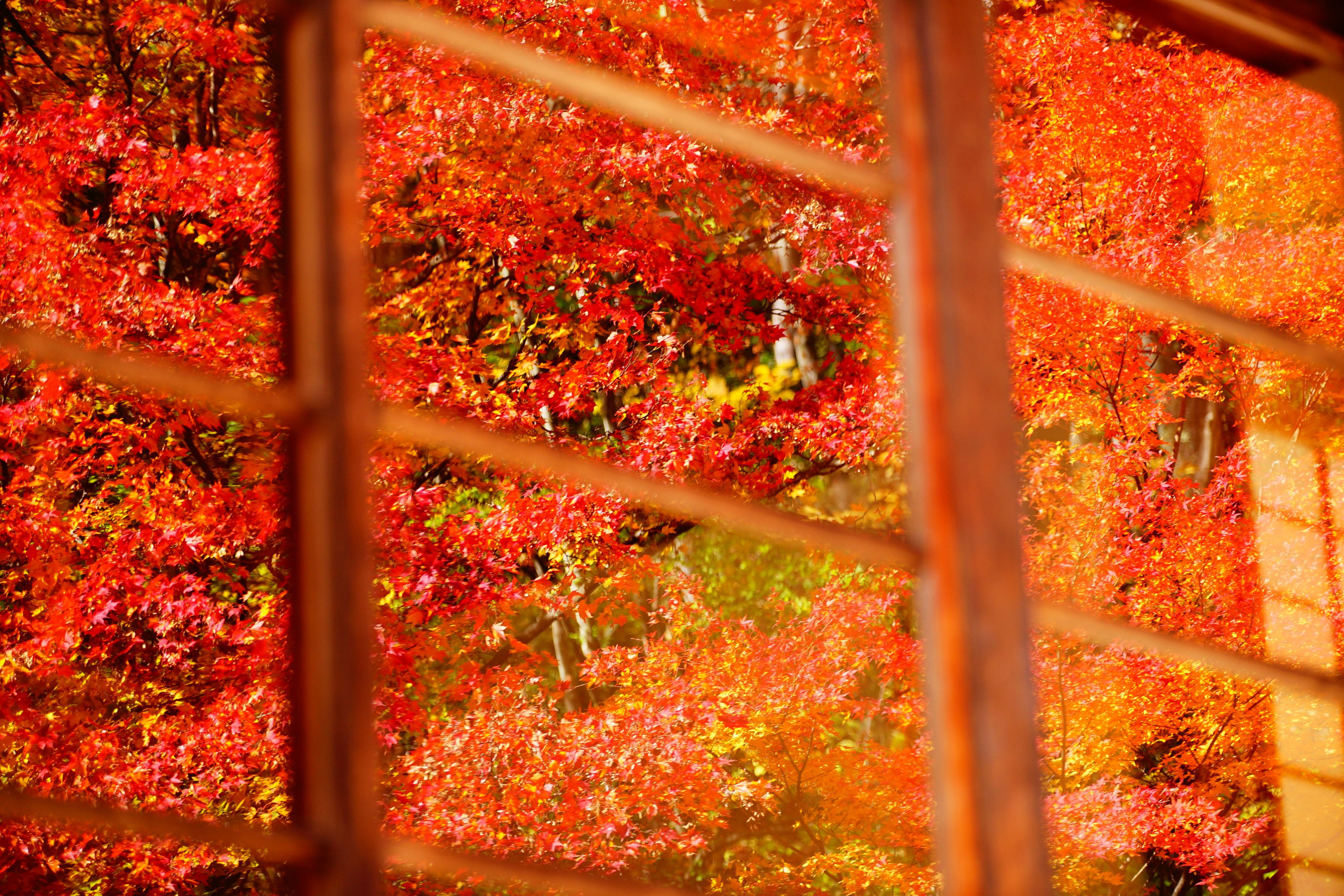 窓ガラスに写り込んだ紅葉が綺麗で思わずシャッターを切りました。