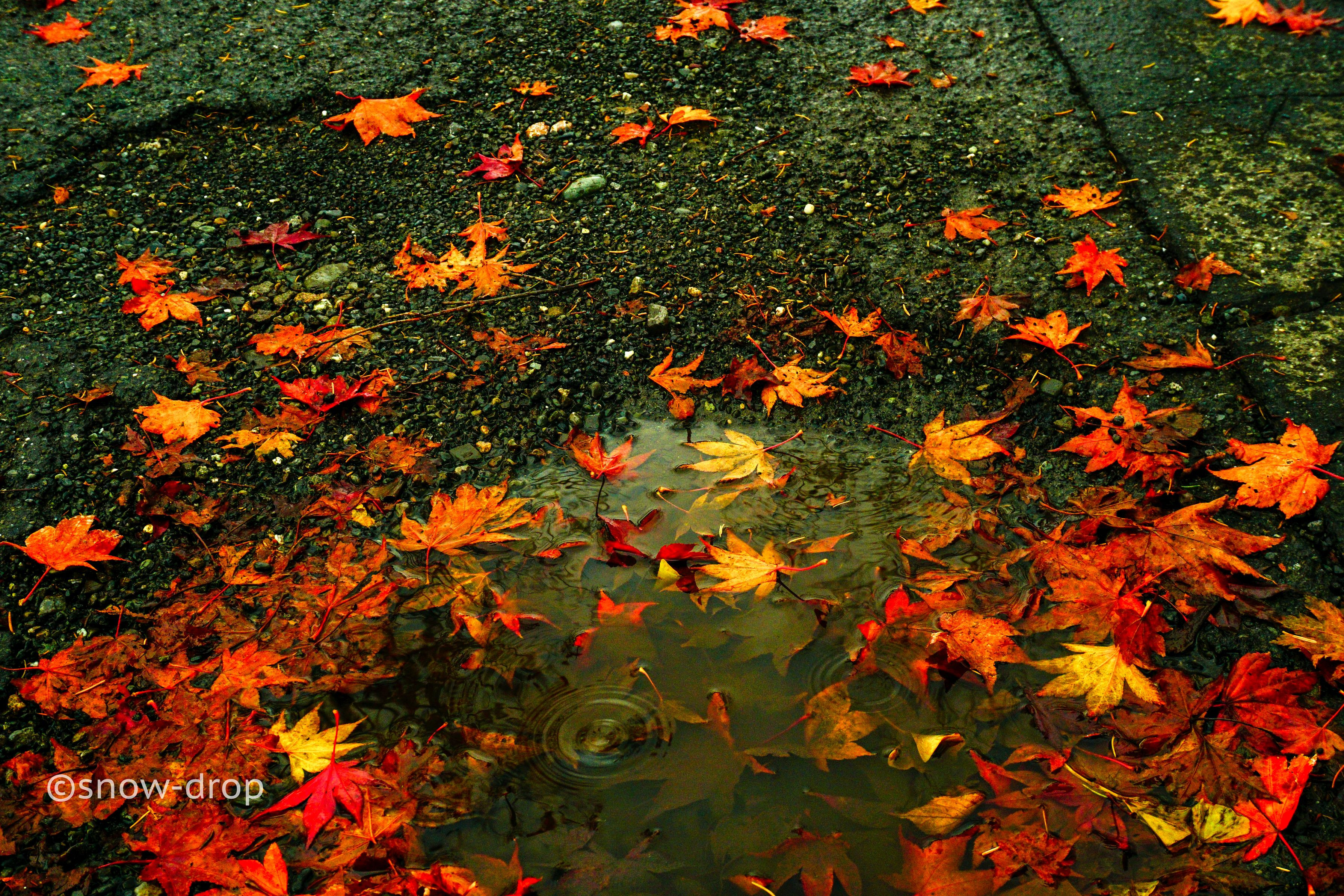 どんより雨が降る日に鮮やかに花咲く落ち葉をとりました。