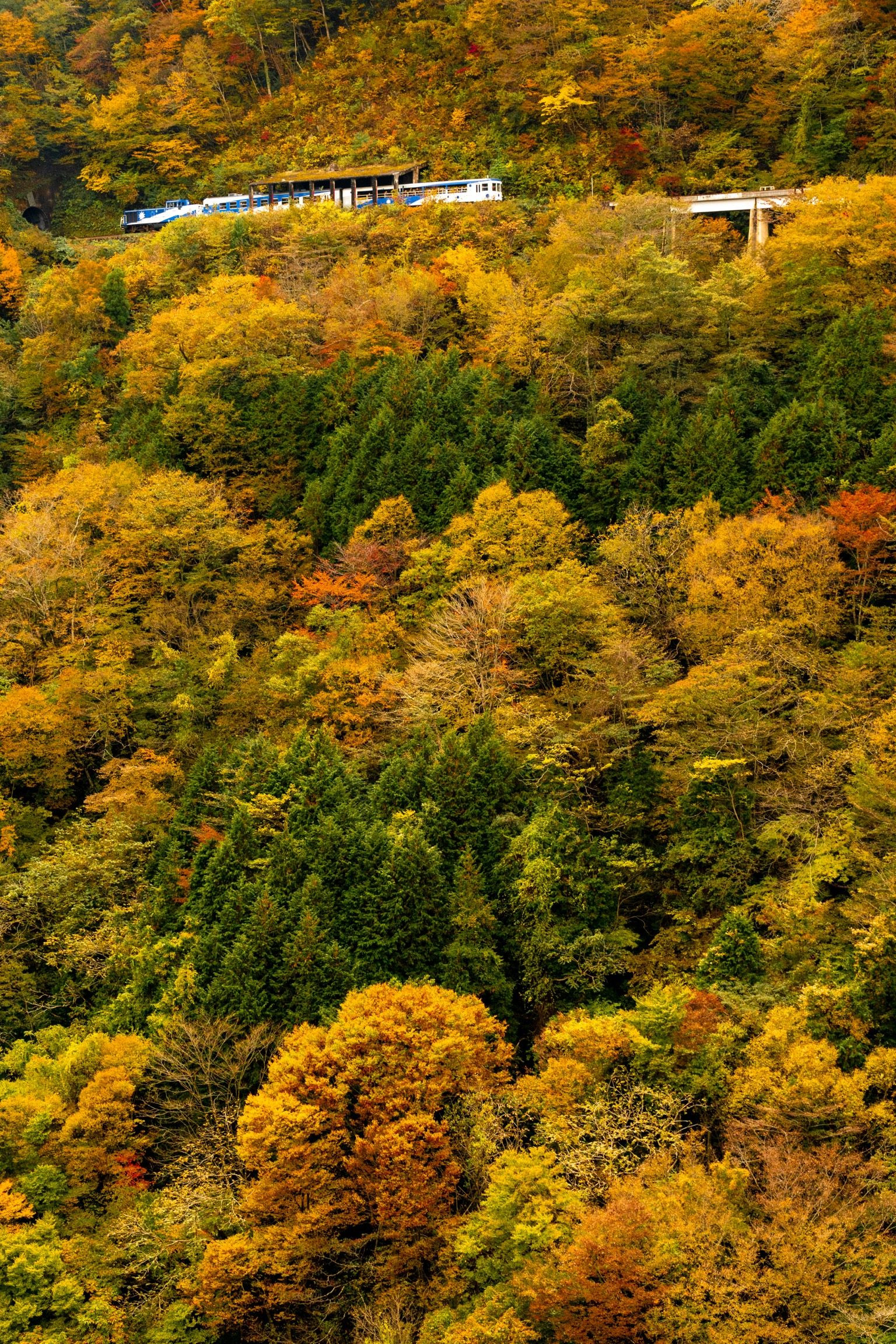 紅葉盛りの山を登り標高700m以上に位置する三井野原へ。 木次線 出雲坂根-三井野原 奥出雲おろち号 おろちループから撮影