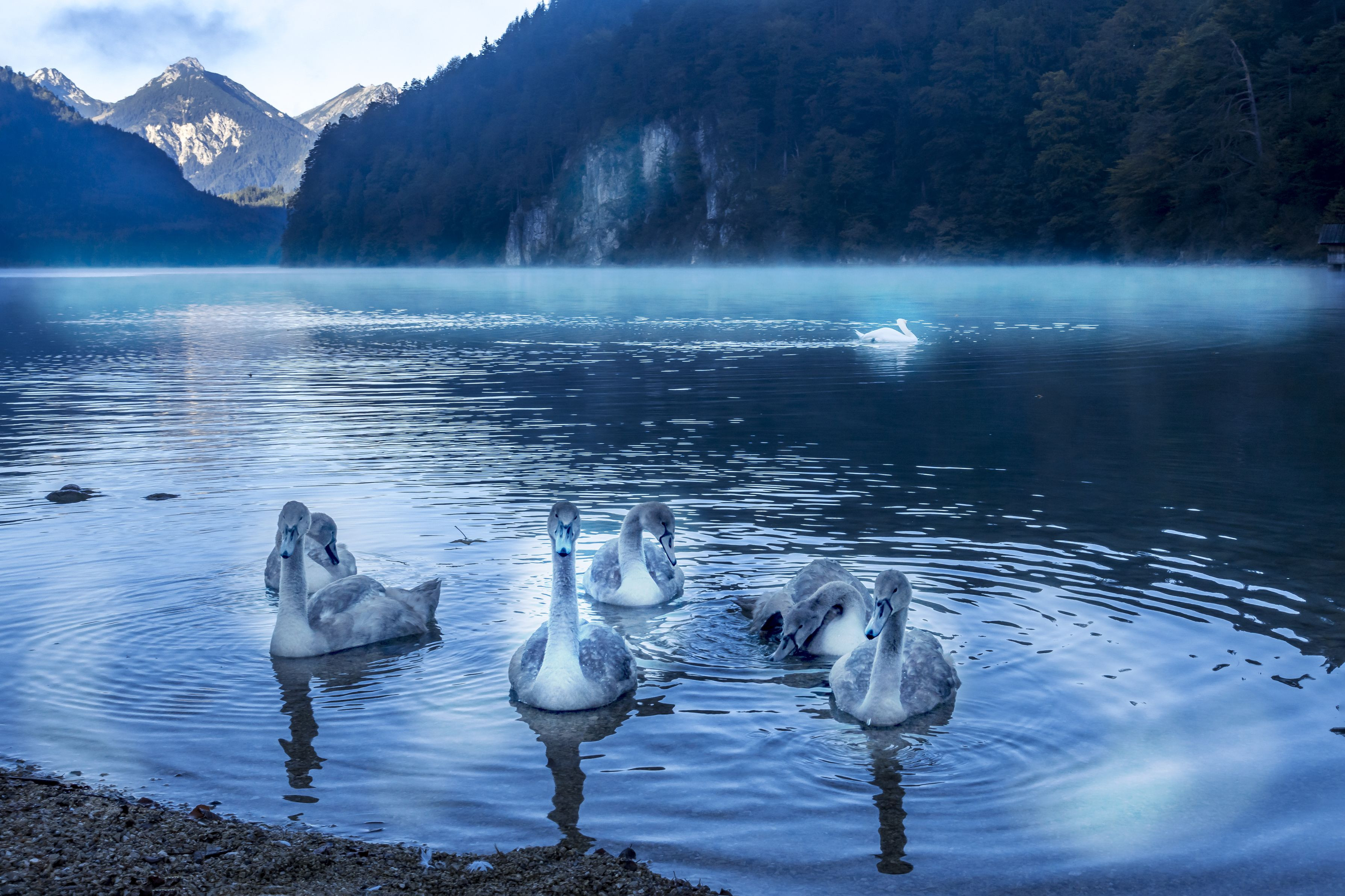 ドイツ定番の観光スポット ノイシュヴァンシュタイン城の麓にある湖、水面から水蒸気が上がっていました