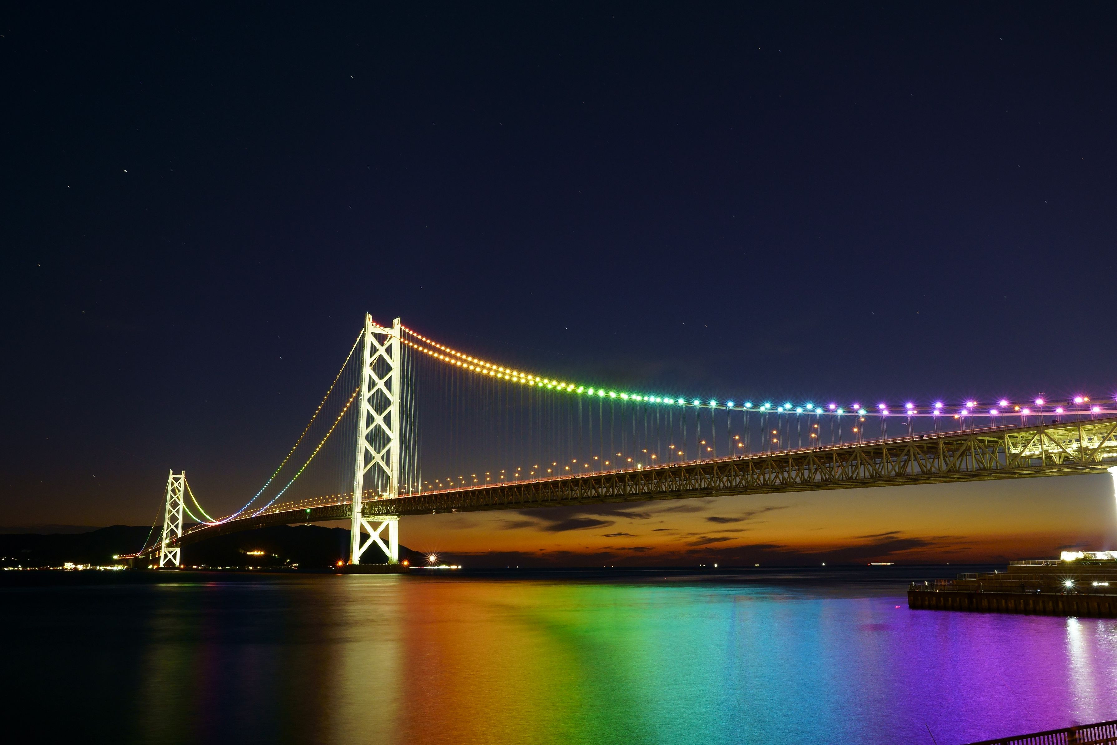 明石海峡大橋のライトアップを撮影してみました。 毎正時から5分間だけのレインボーカラーです。