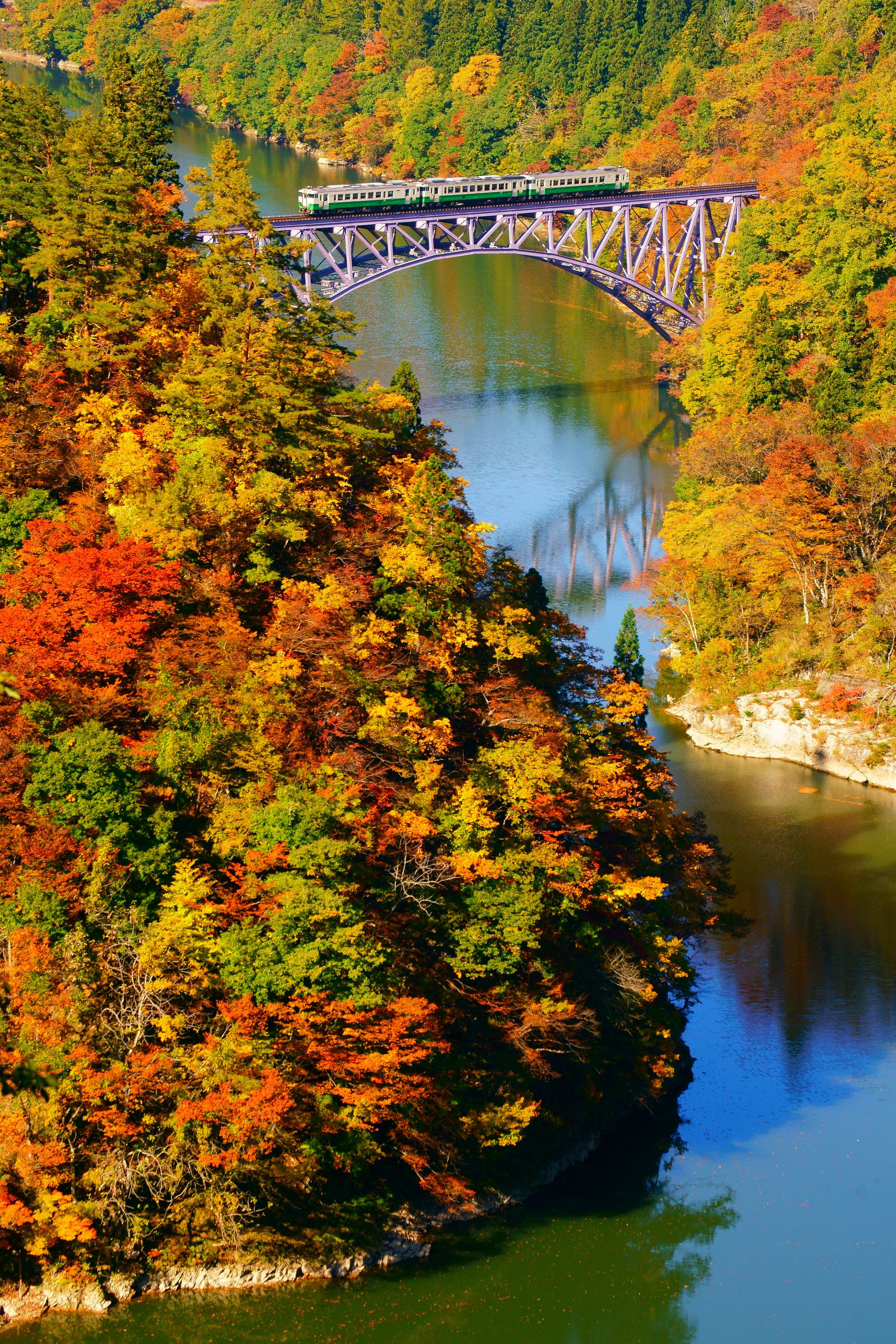 秋が深まりつつある只見線の只見川橋梁を撮りました。 先週は紅葉がまばらだったので、秋真っ盛りの只見線沿線の風景をおさめるべく、 再び撮りに出かけました。 まさに「錦秋」という表現が当てはまる風景に出会うことが出来ました。 ただ、川面の鏡像がよく見える位置からとれば、より良い絵になったかも?