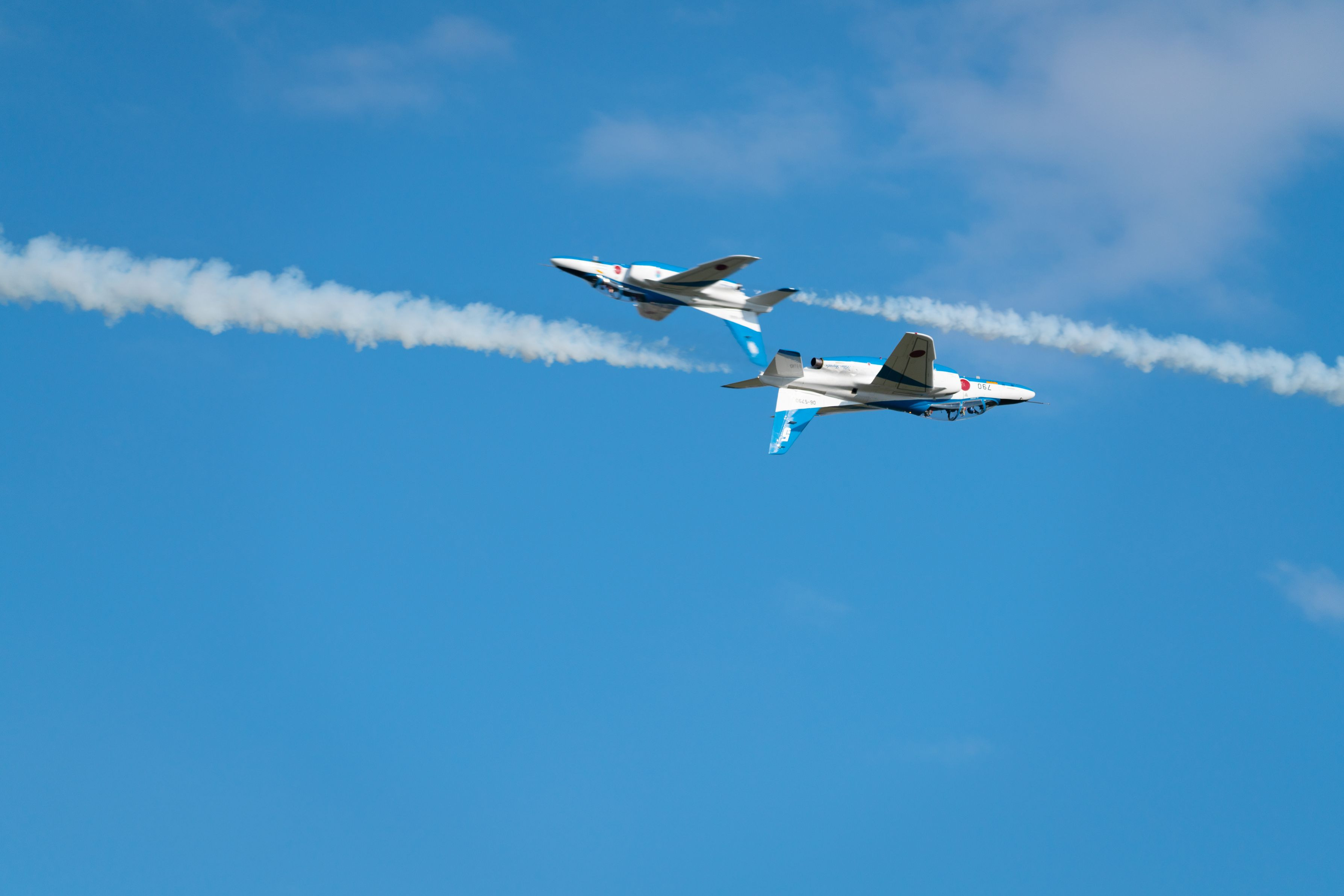 ブルーインパルスの技の一つであるタッククロスの背面で交差する瞬間を捉えました。