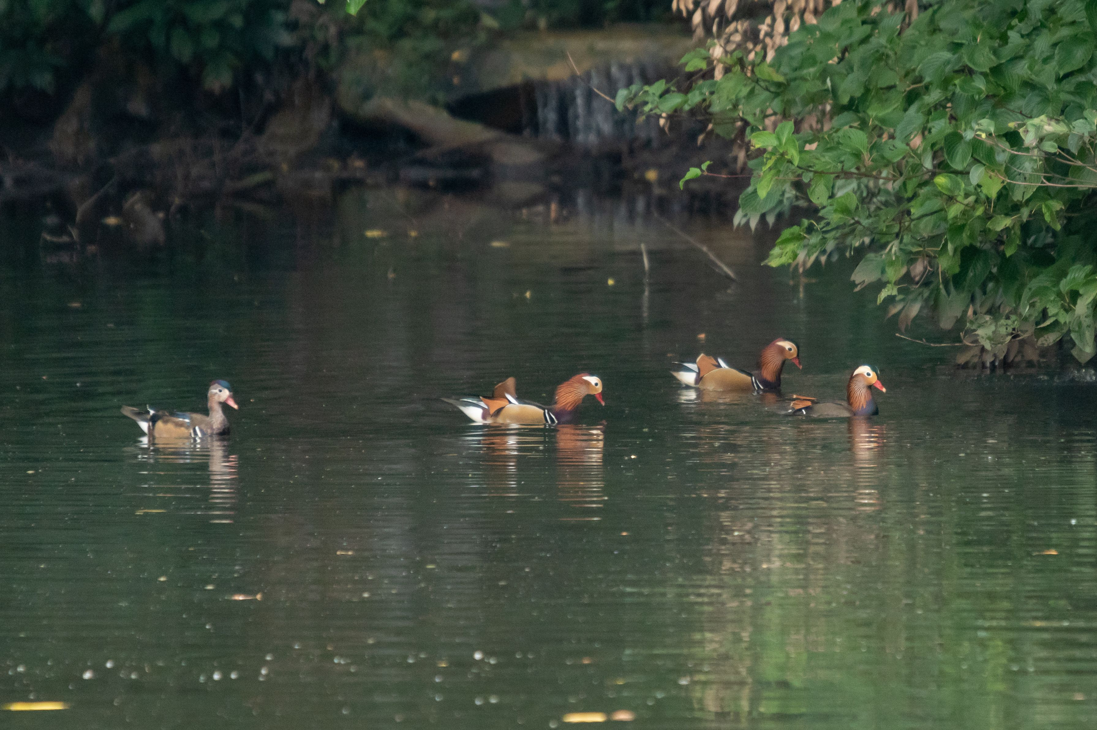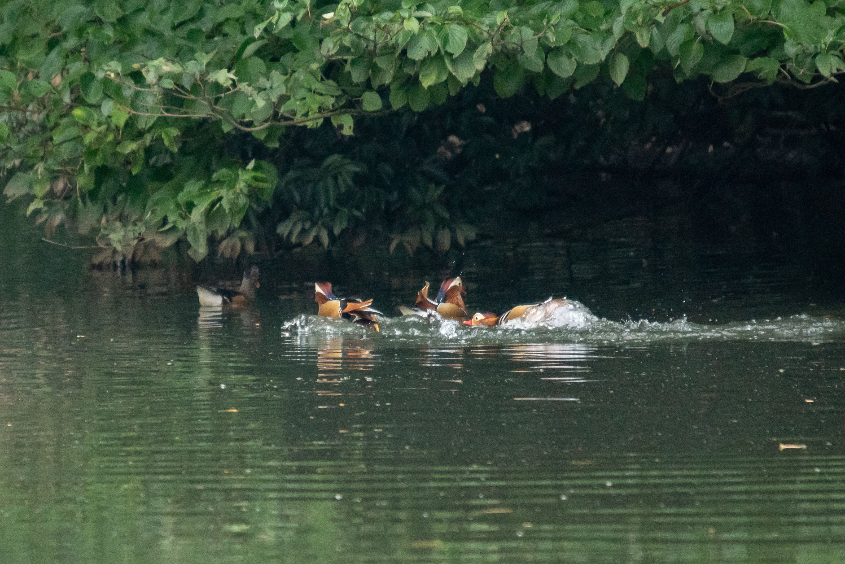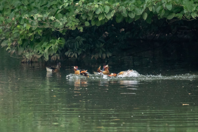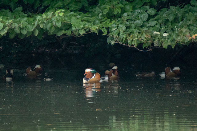第一陣の到着と間もなくの、侵入者により一度は飛び去ったオシドリ。