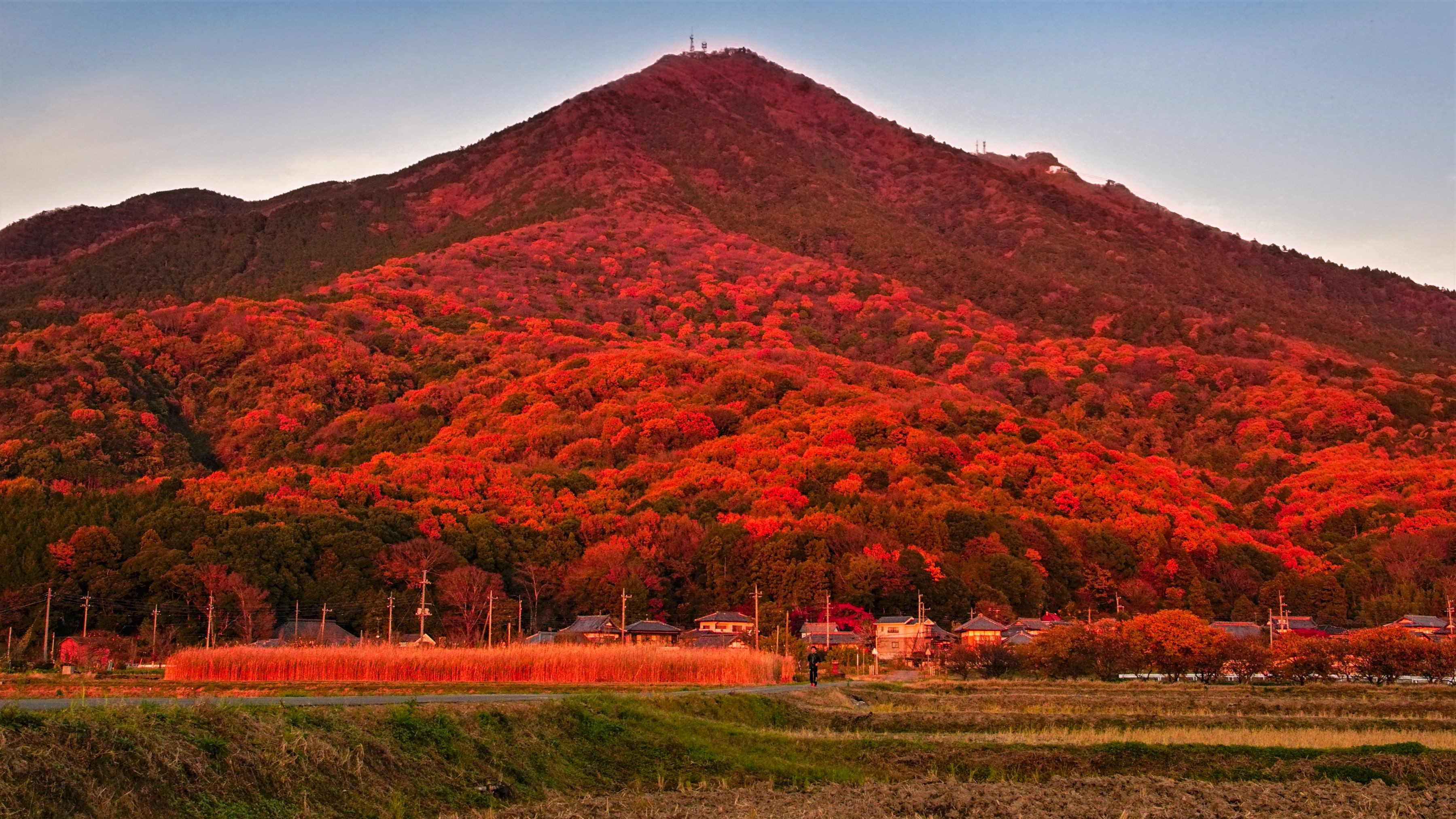 茨城県筑波山が西陽を受けて燃えてるように見えた。