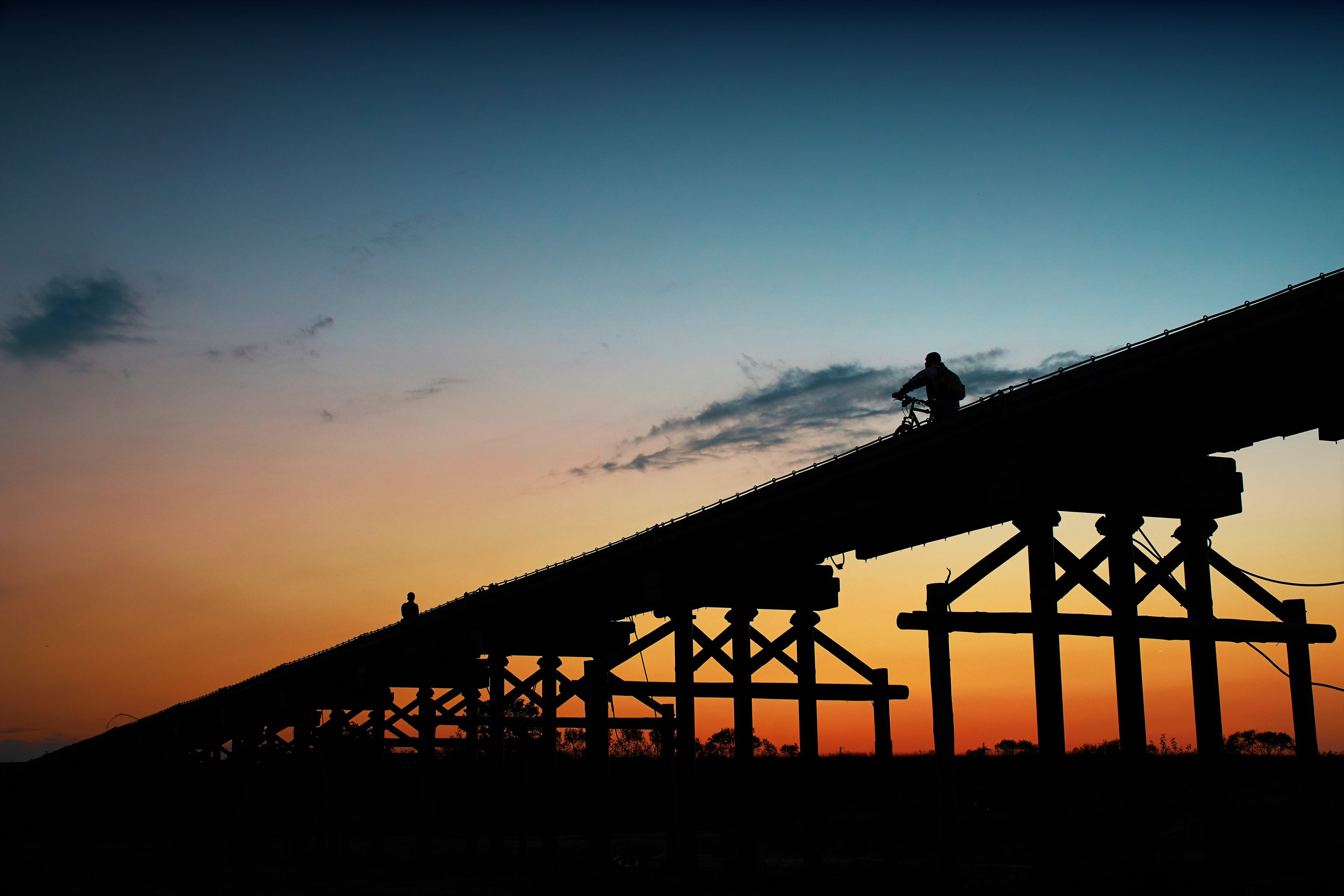 時代劇の映画やドラマでよく登場する、京都府八幡市の流れ橋です。大雨による増水のため流されてばかりなので、2016年の大規模改修で75cmかさ上げされ、橋脚の数が約半分に減りました。また、一部の橋脚がコンクリート製になっています。それでも去年また流されて、約8ヶ月間通行できませんでした。
