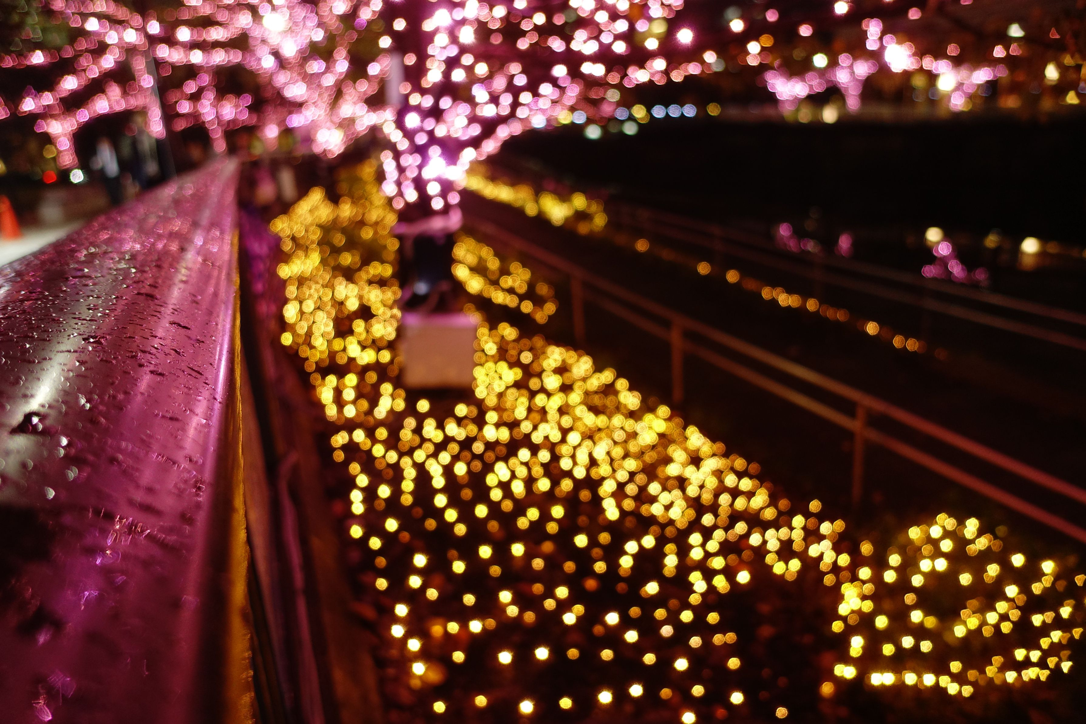 品川区で開催中の「目黒川みんなのイルミネーション」にて。 毎度ながら主役を決めづらい、撮るには難しいと思っている、イルミネーションイベントです^^。 今回は、ピンクに染まる手すりの水滴を主役にしてみました。