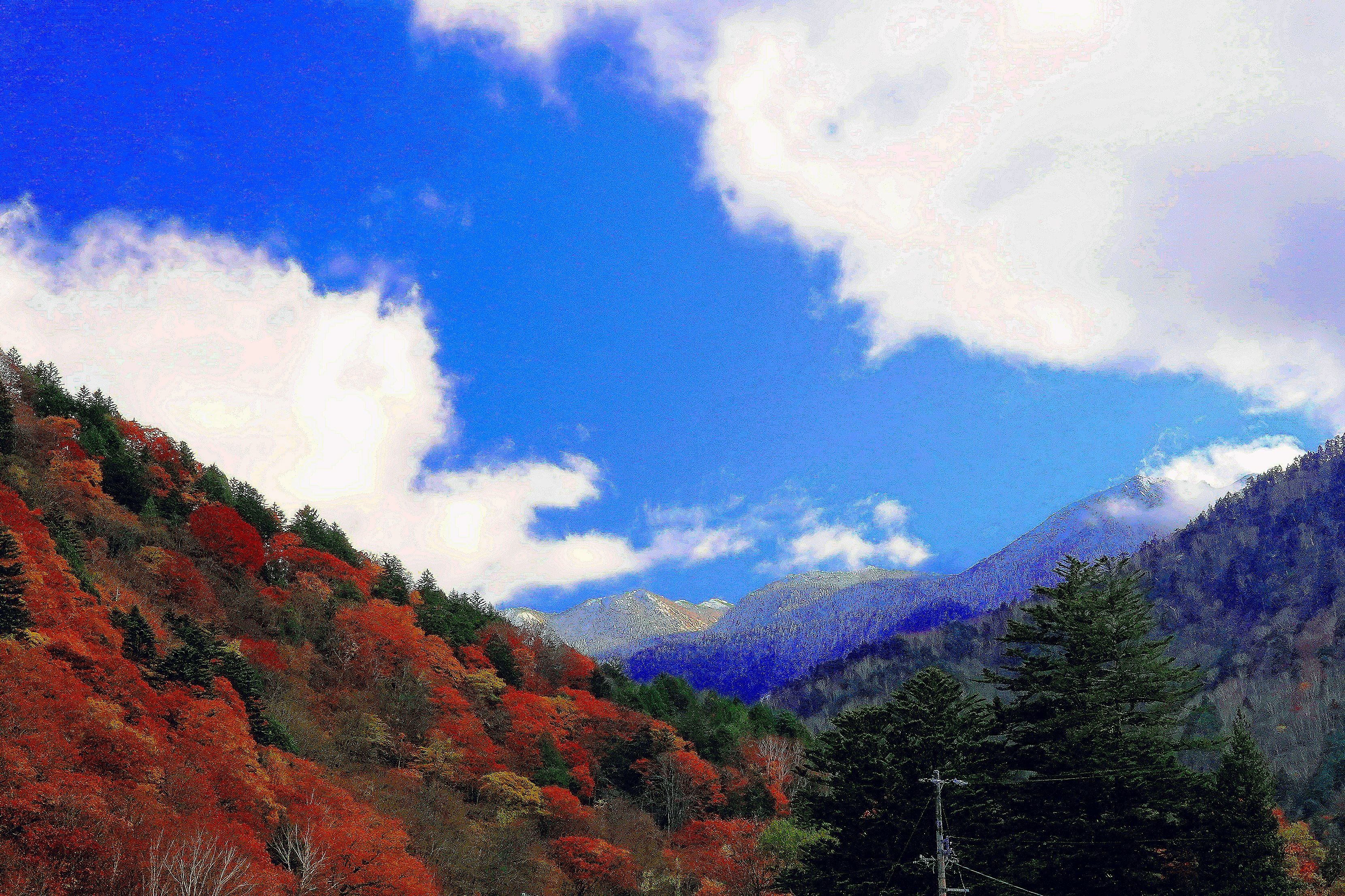 旅で、出会った、紅葉と、初冠雪のコラボ