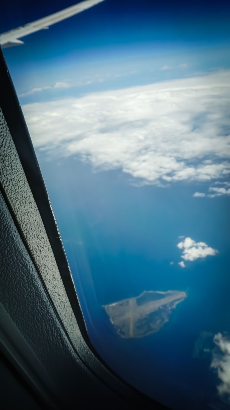種子島の横にある馬毛島。たまにニュースに出てきてる。 787の翼が写真に入れるのと、窓枠のほうにピントを合わせた。