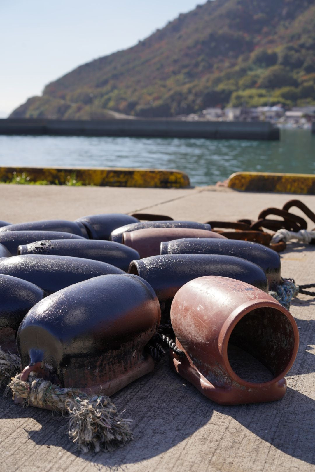 蛸壺が岸壁に多数置かれていました。次の漁で海に投入される前の一休みといったところでしょうか。