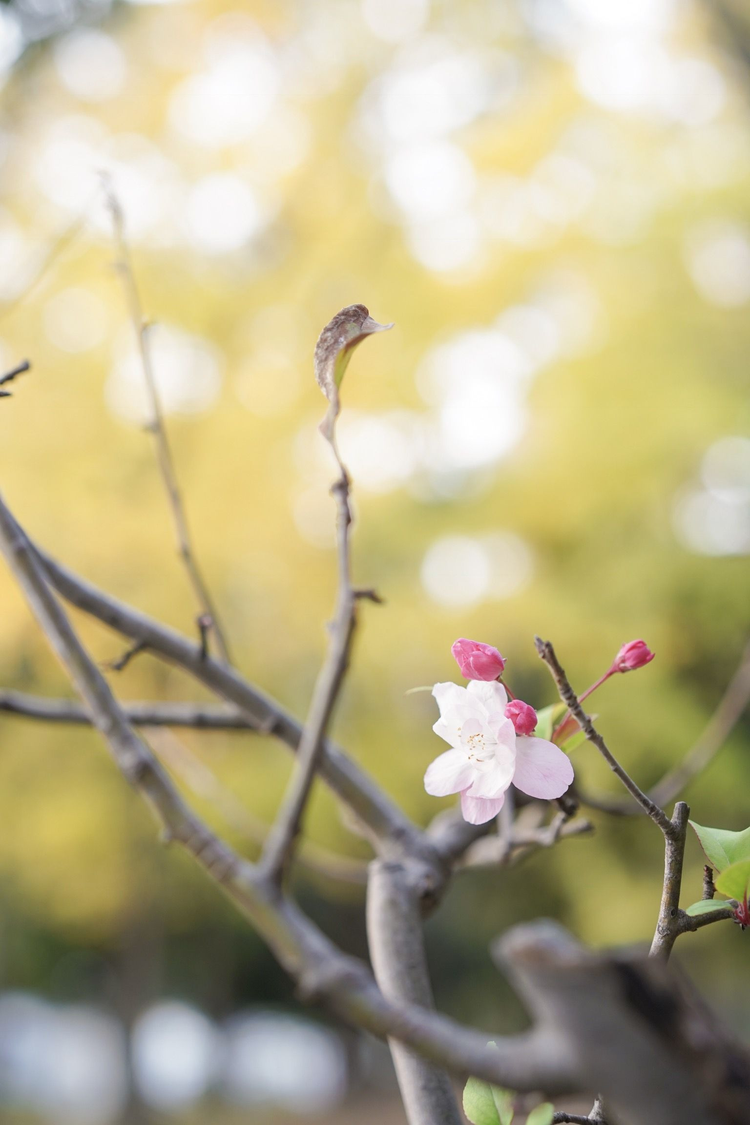 黄色に色付くイチョウの木の前で桜が一輪だけ咲いていました