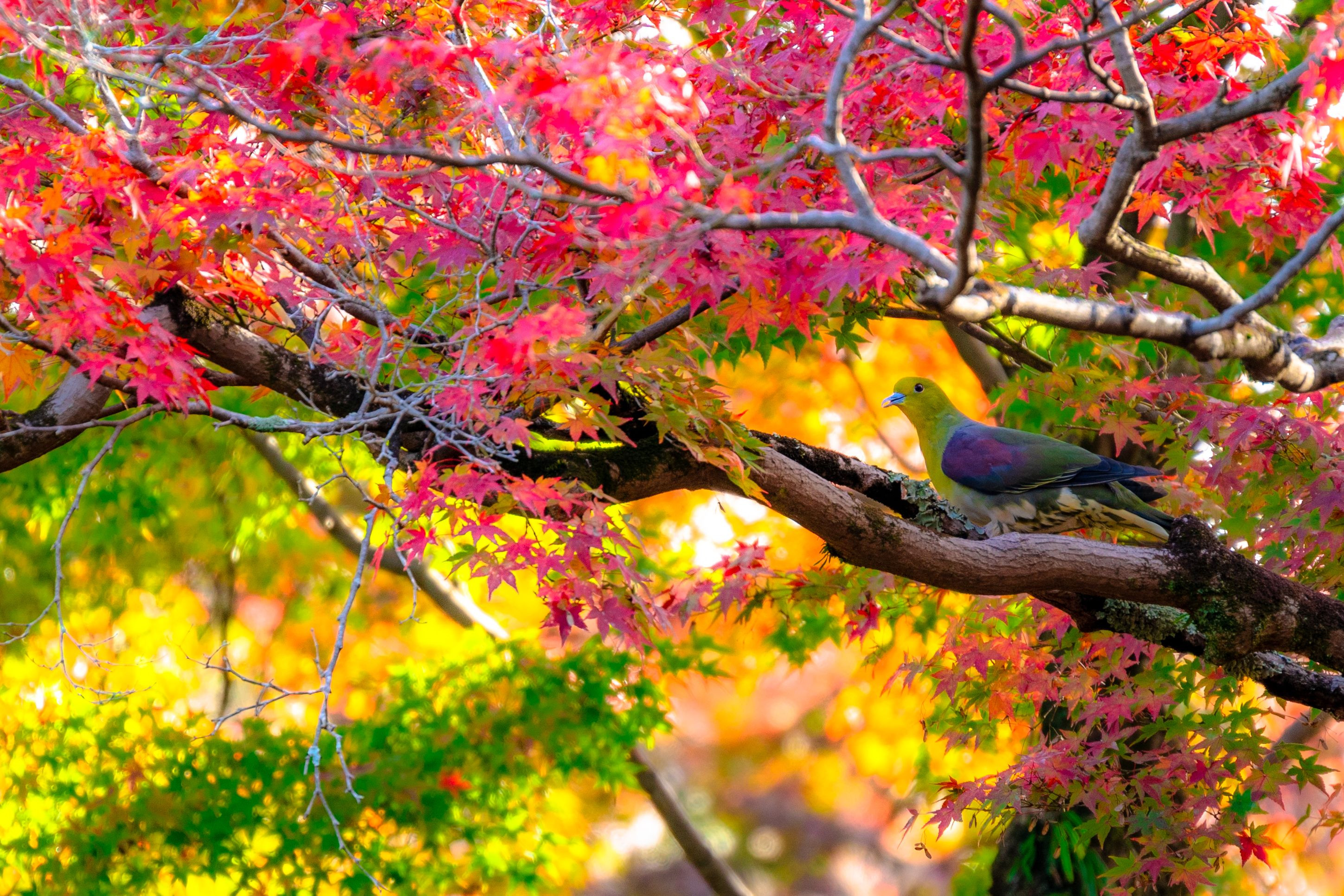 奈良公園にて紅葉×鹿の組み合わせを狙っていたところ、なんとアオバトを発見。 鮮やかさの饗宴を収められてこの秋いちばんの満足でした。 #アオバト#