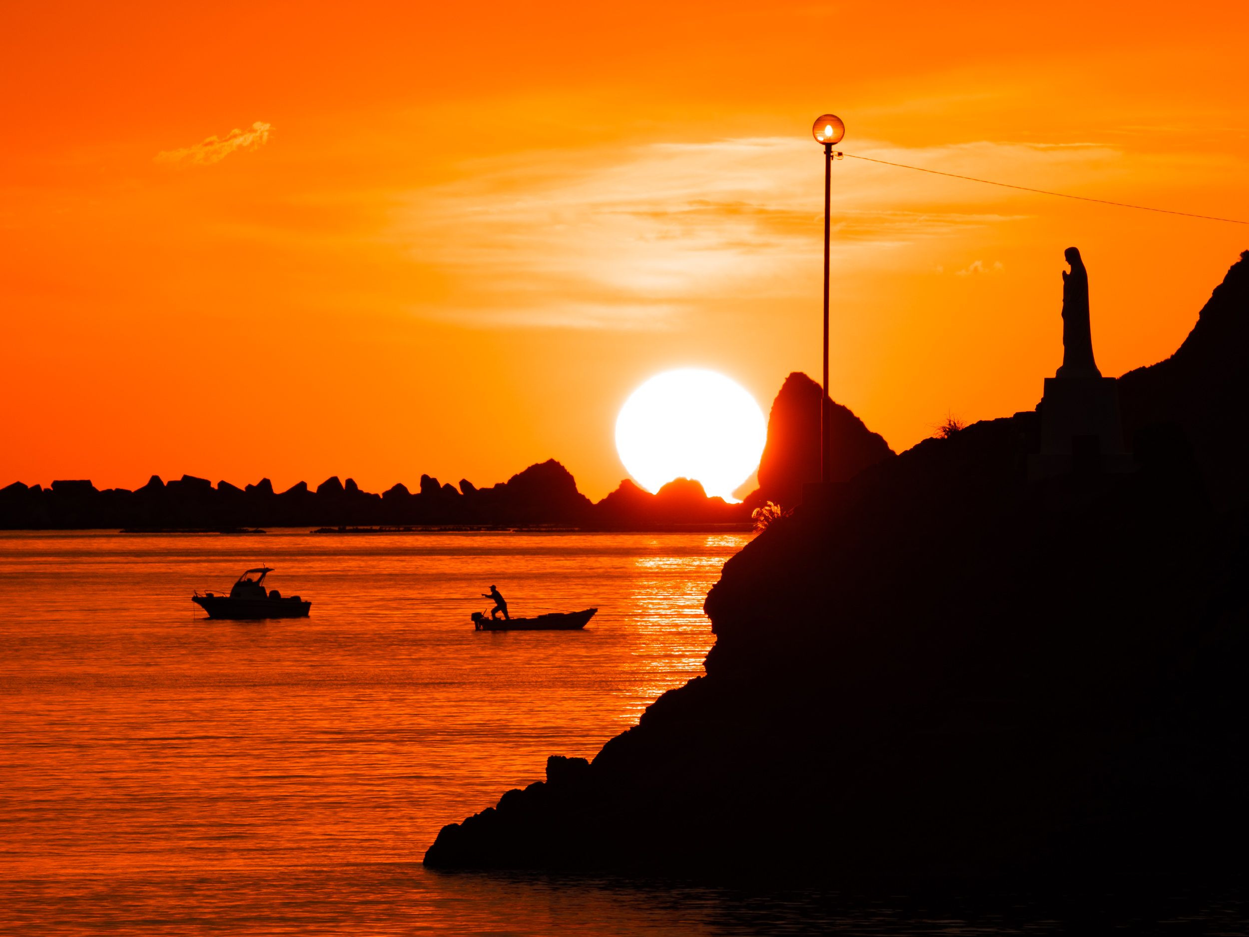 崎津集落の海上マリア像です。まんまるな太陽と舟人、そしてそれを見つめるマリア様がとても美しかったです。