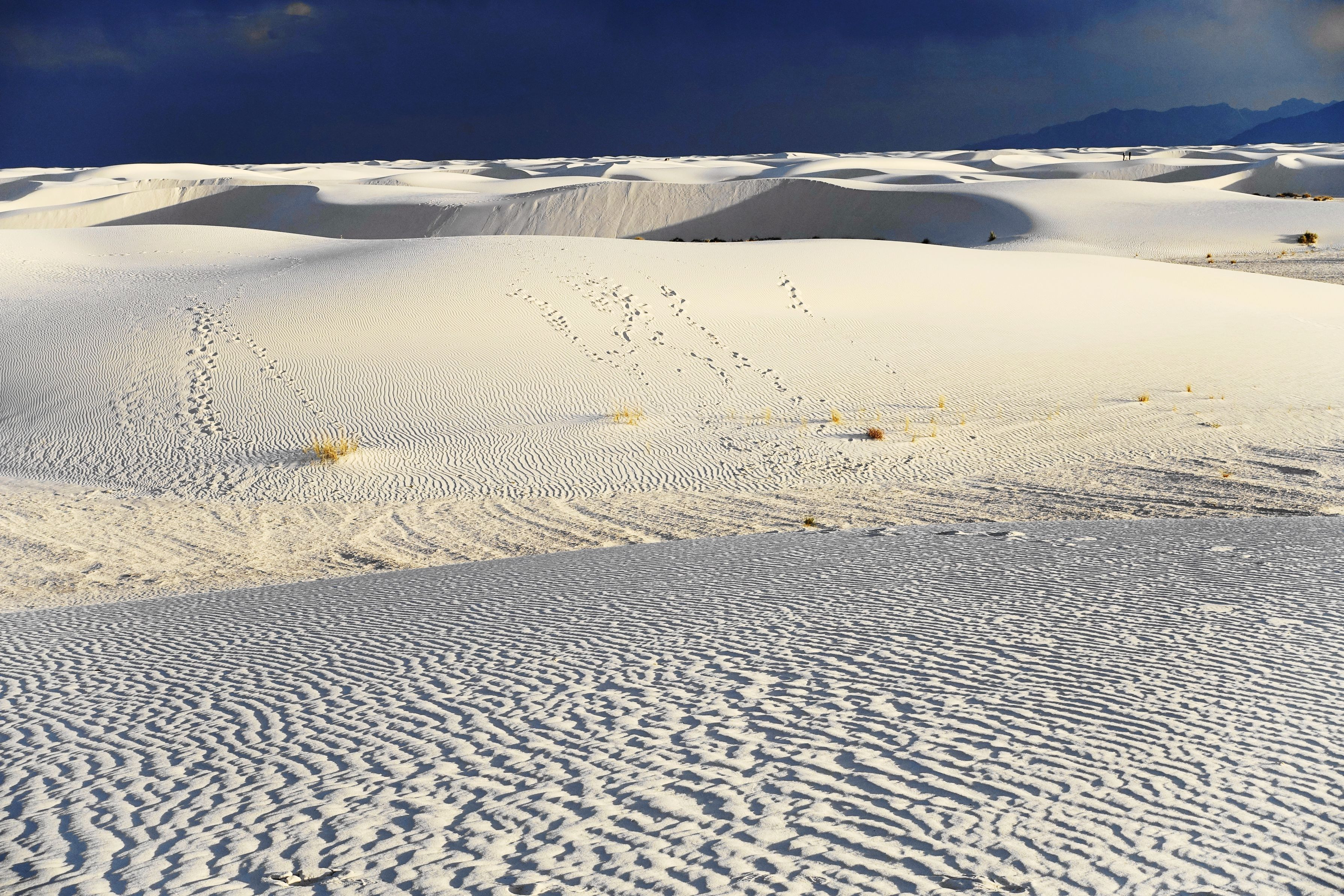USAのニューメキシコ州にあるホワイトサンズ国定公園です。白い砂の広い大砂丘地帯で、砂は石膏の結晶です。夕方の時間帯に合わせて訪れたので、陰が起伏を強調する画が撮れました。