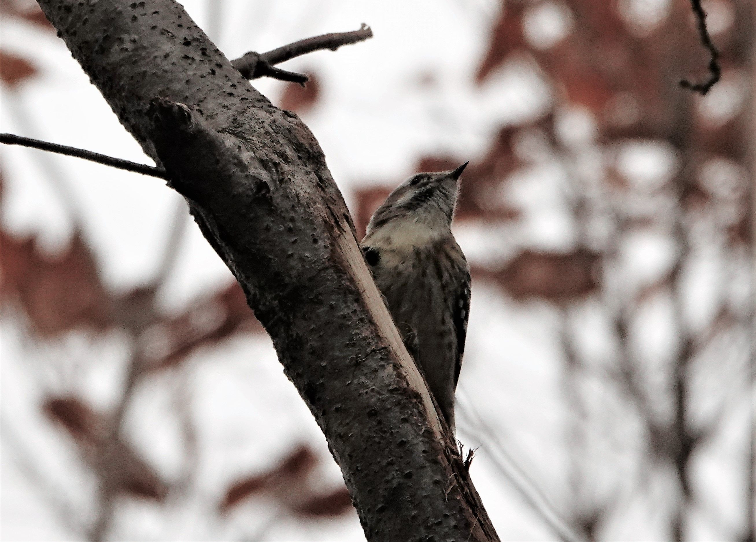 紅葉をバックにして 珍しくじっとしてくれたコゲラさん