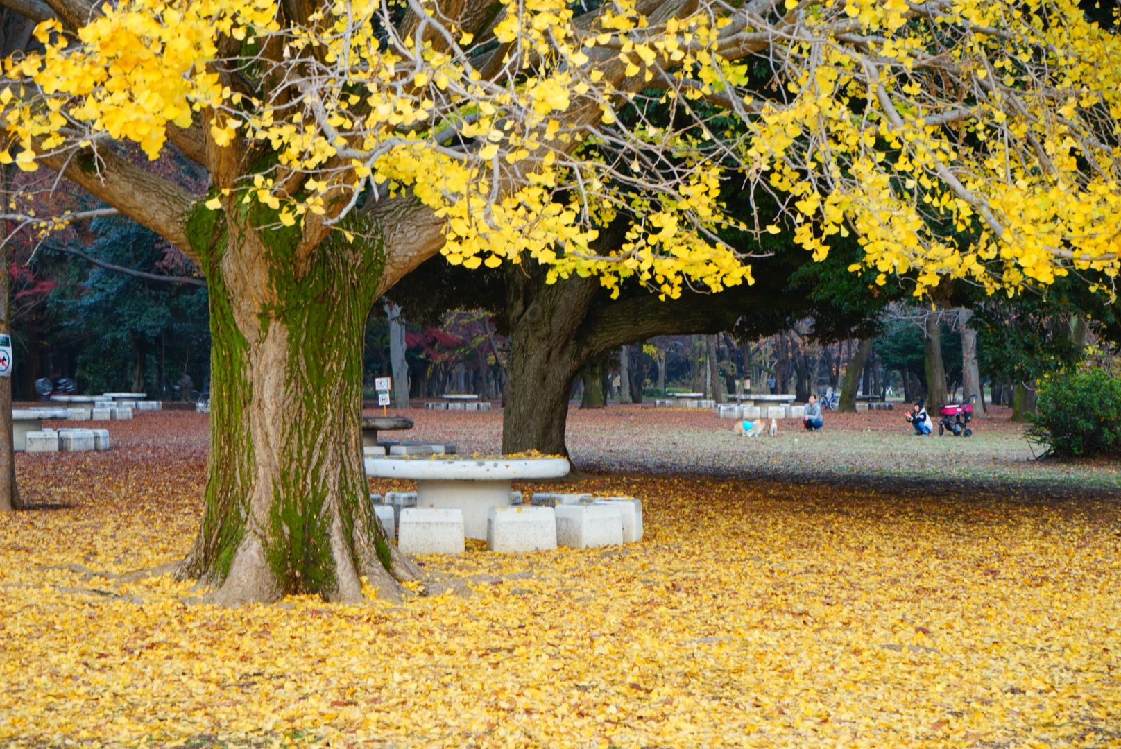 落ち葉の黄色と木の幹の苔のグリーンが鮮やか