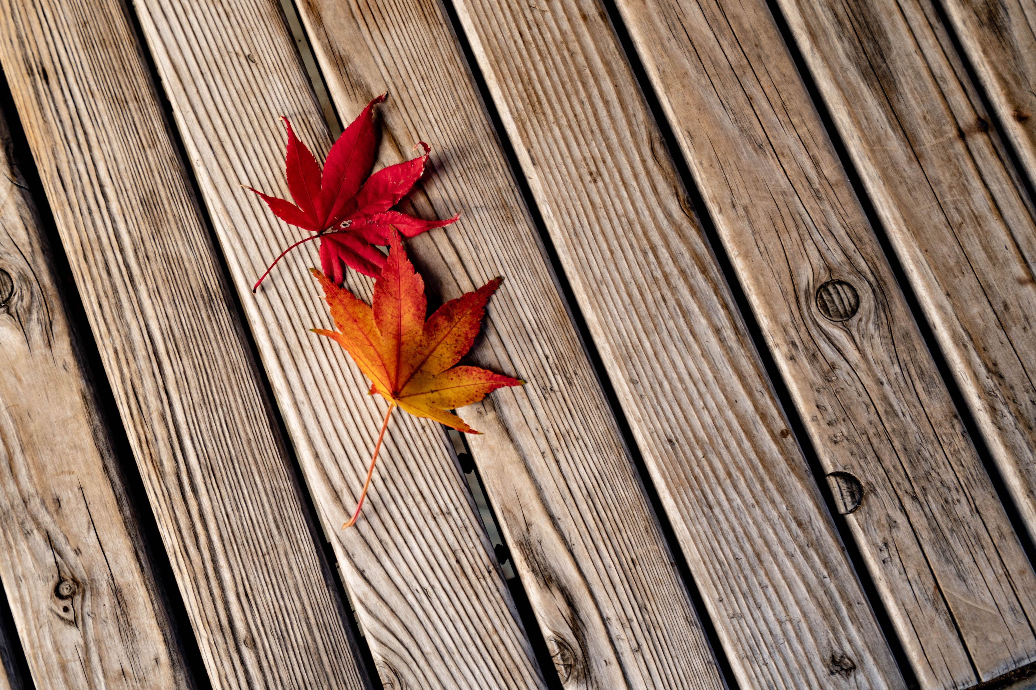 ベンチに仲良く2枚の紅葉が寄り添うように落ちていました、