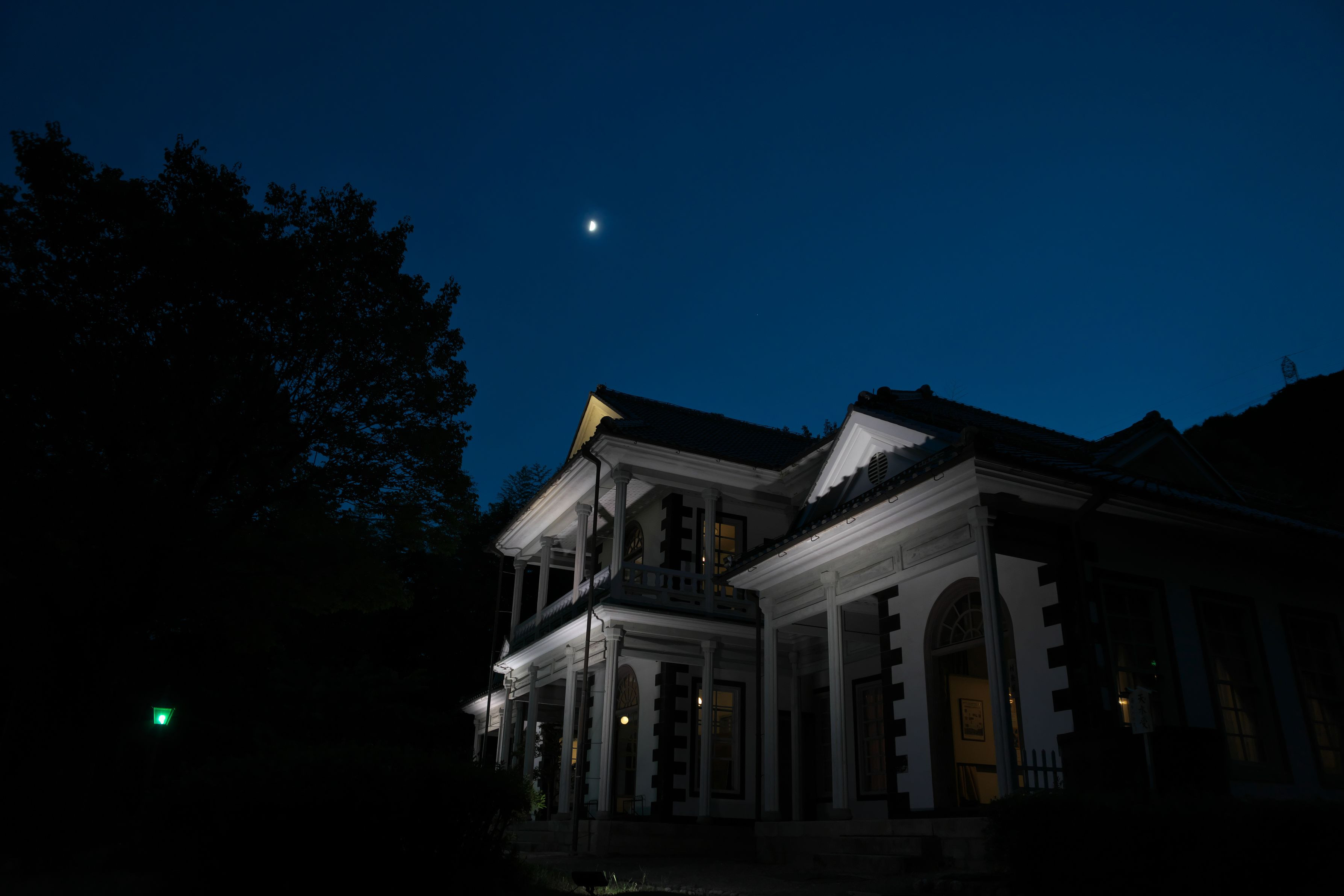 明治村二丁目の一番奥の建物ですね。夕焼けが過ぎ去り、ちょうど月が昇ってきたので、そいやと。