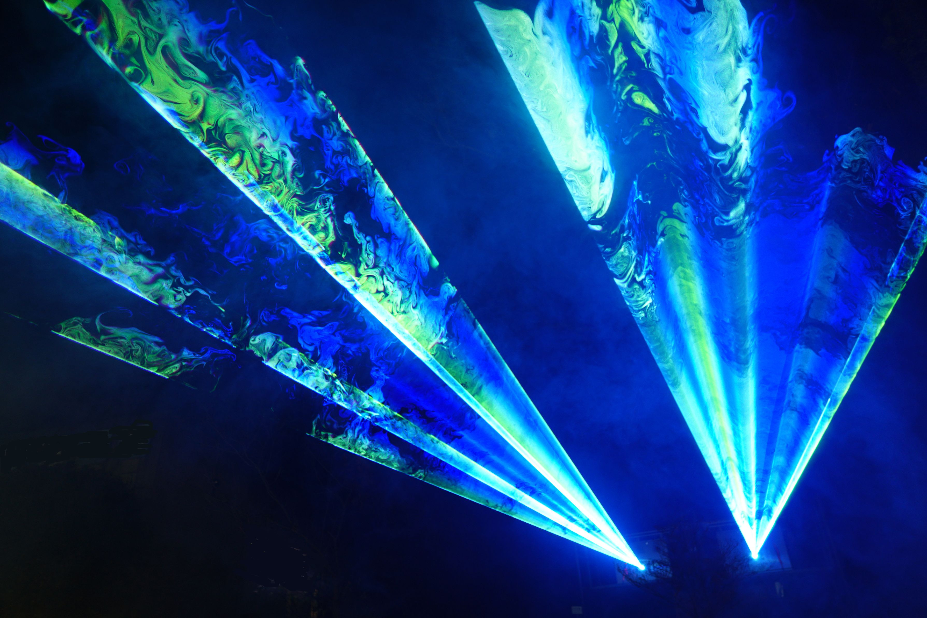 水蒸気か煙かわかりませんでしたが、レーザー光が当たると不思議な模様が出現し動き回ります。直線的なビームとは違い、初めてでした。