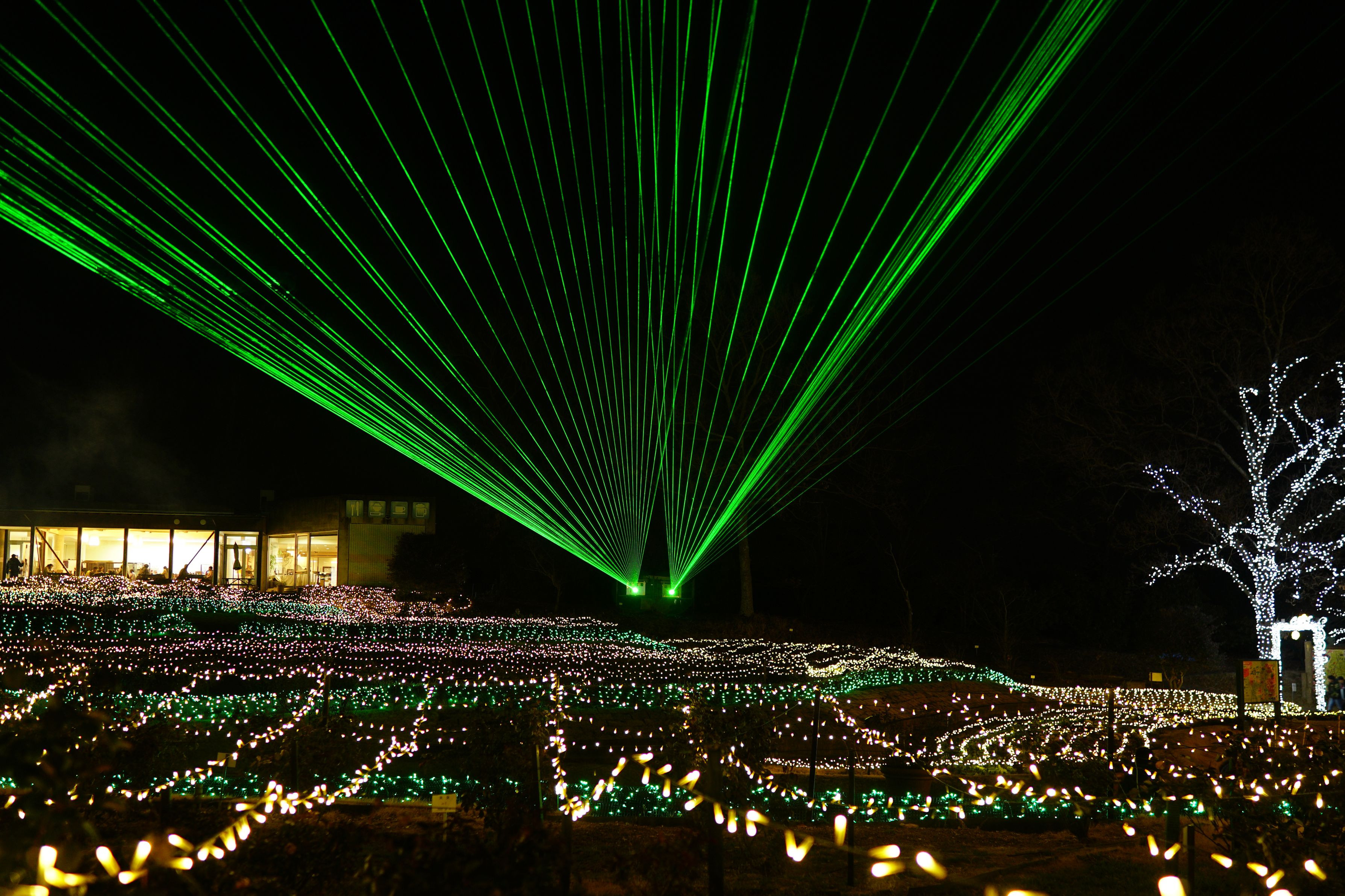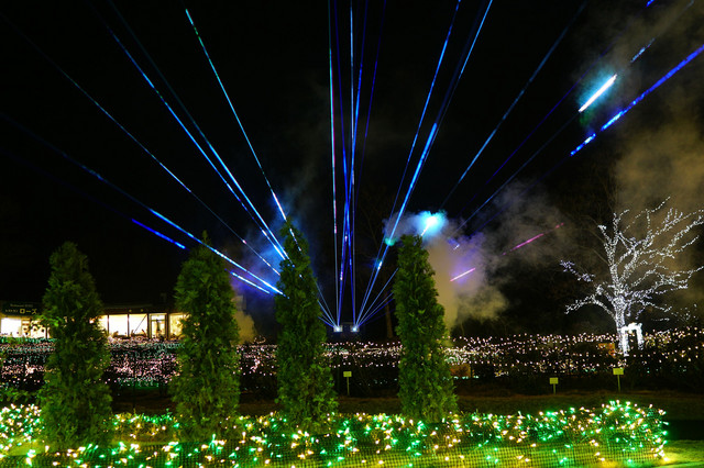 茨城県フラワーパークで、イルミネーションとレーザー光の共演がありました。