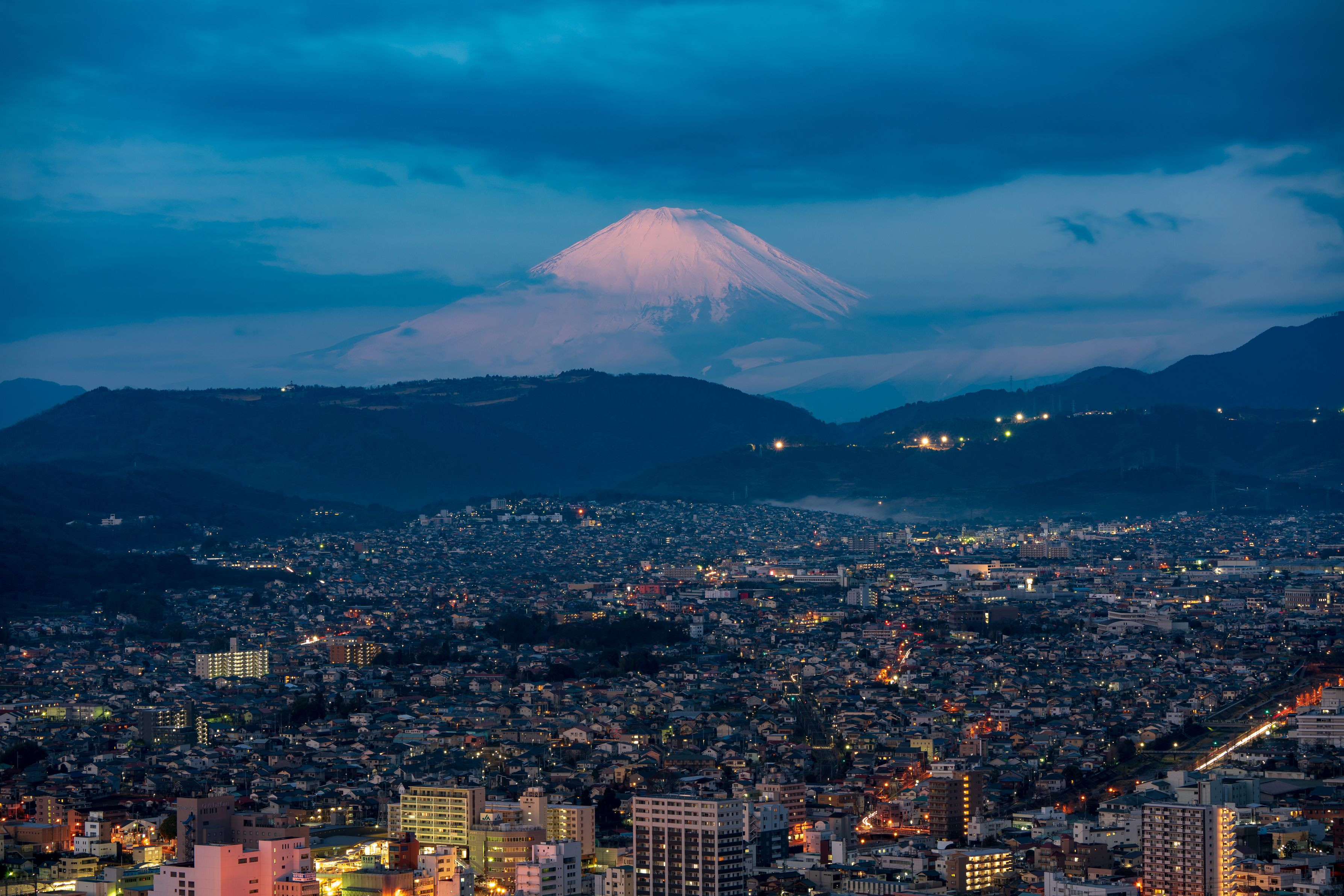 朝日を撮ろうと思ってましたが、あいにくの曇り空。 反対方向を向くと少し明るくなってこれから朝を迎える街と富士山が印象的でした。