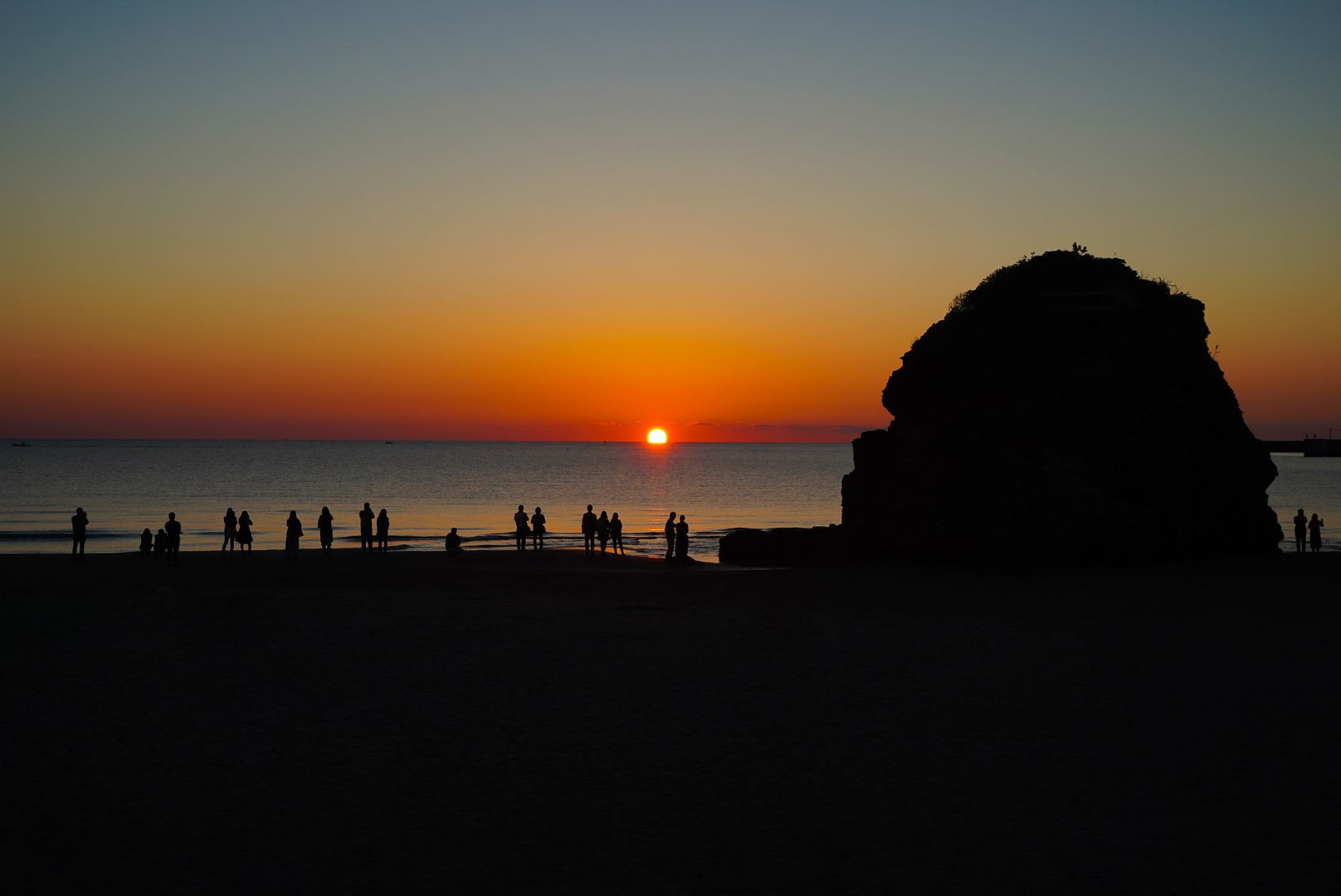 日本遺産にも登録された、島根県出雲は稲佐の浜の夕日。雲がない分、美しい夕日が見られました。