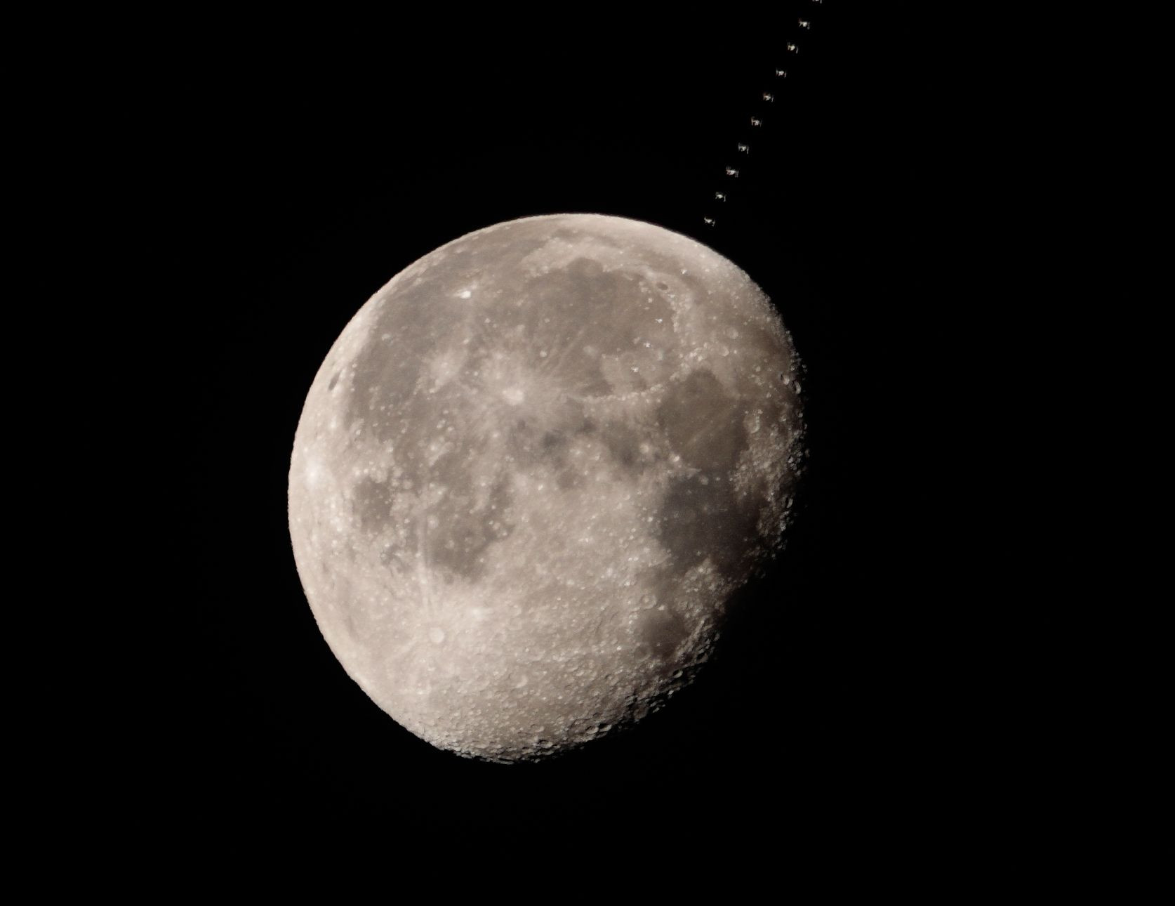 月面を横切る国際宇宙ステーション(ISS) 2018年12月26日5:30ごろ 予報通り、月面をISSが通過する。 19枚合成