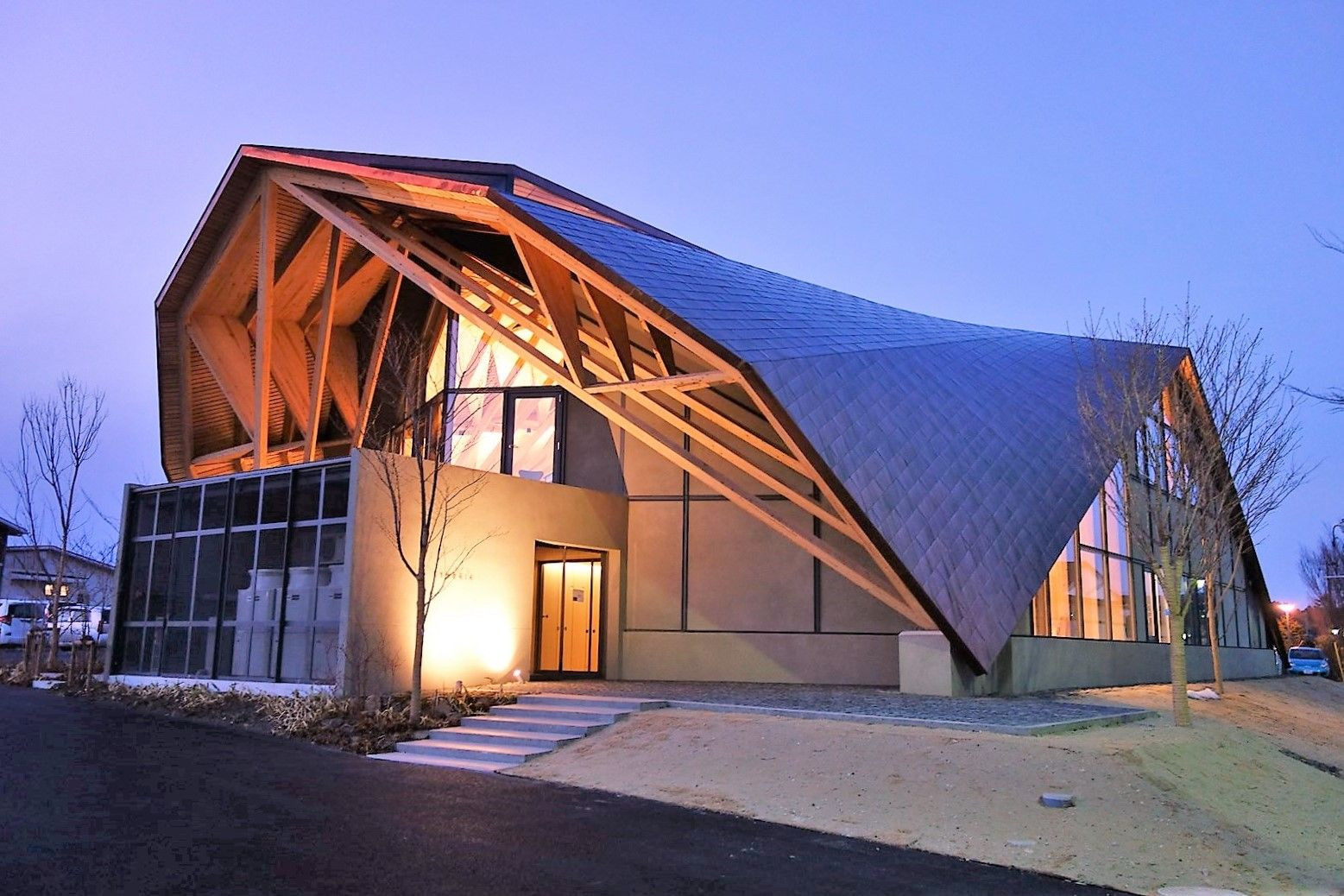 最近完成した某会社の社屋 木造のトラス架構構造 内部も見学したいですね・・・=^_^