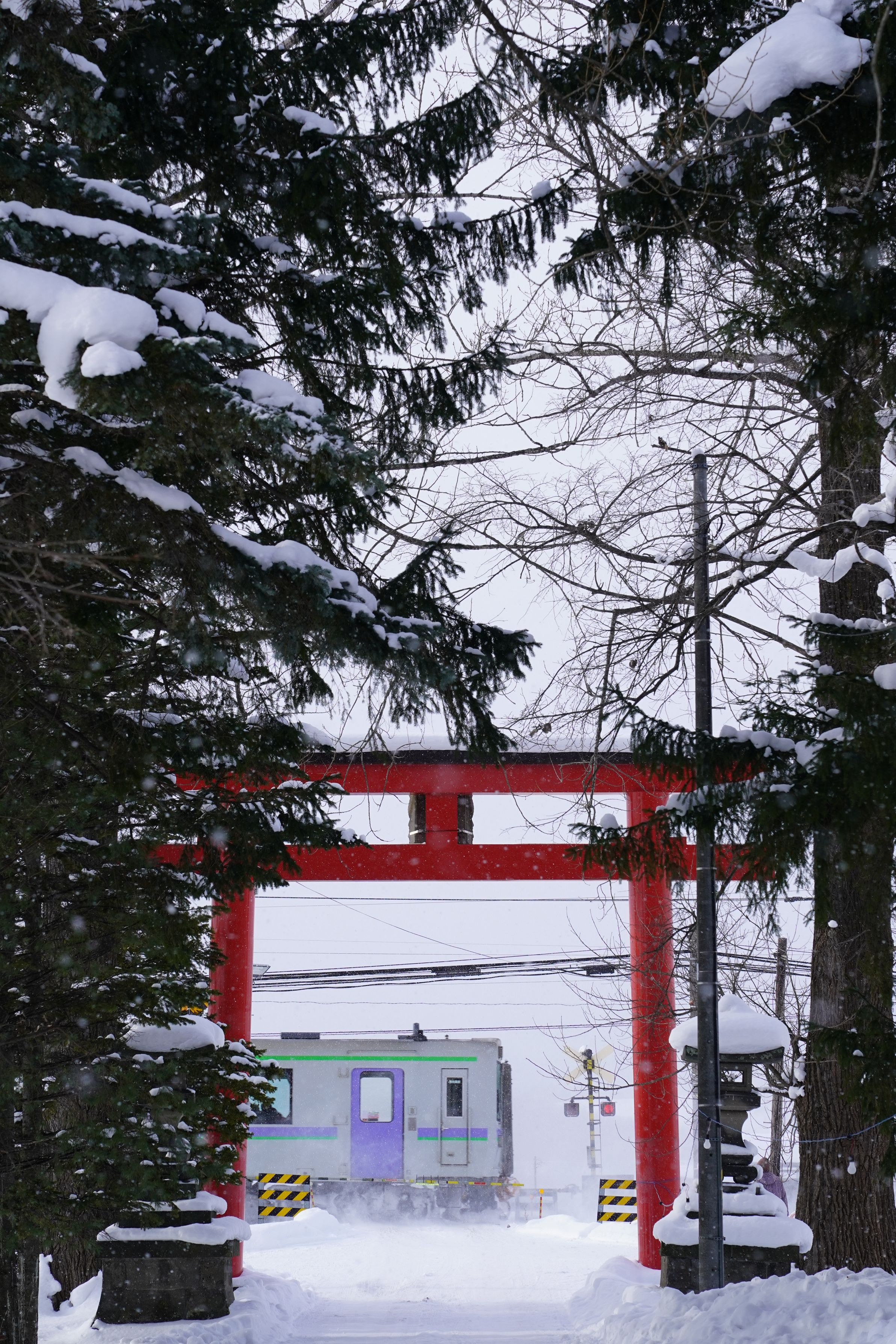 富良野線沿線、線路のすぐ近くに建つ神楽神社。 参道から鳥居越しに走り抜ける列車をパチリ。 (富良野線 西神楽~西聖和)