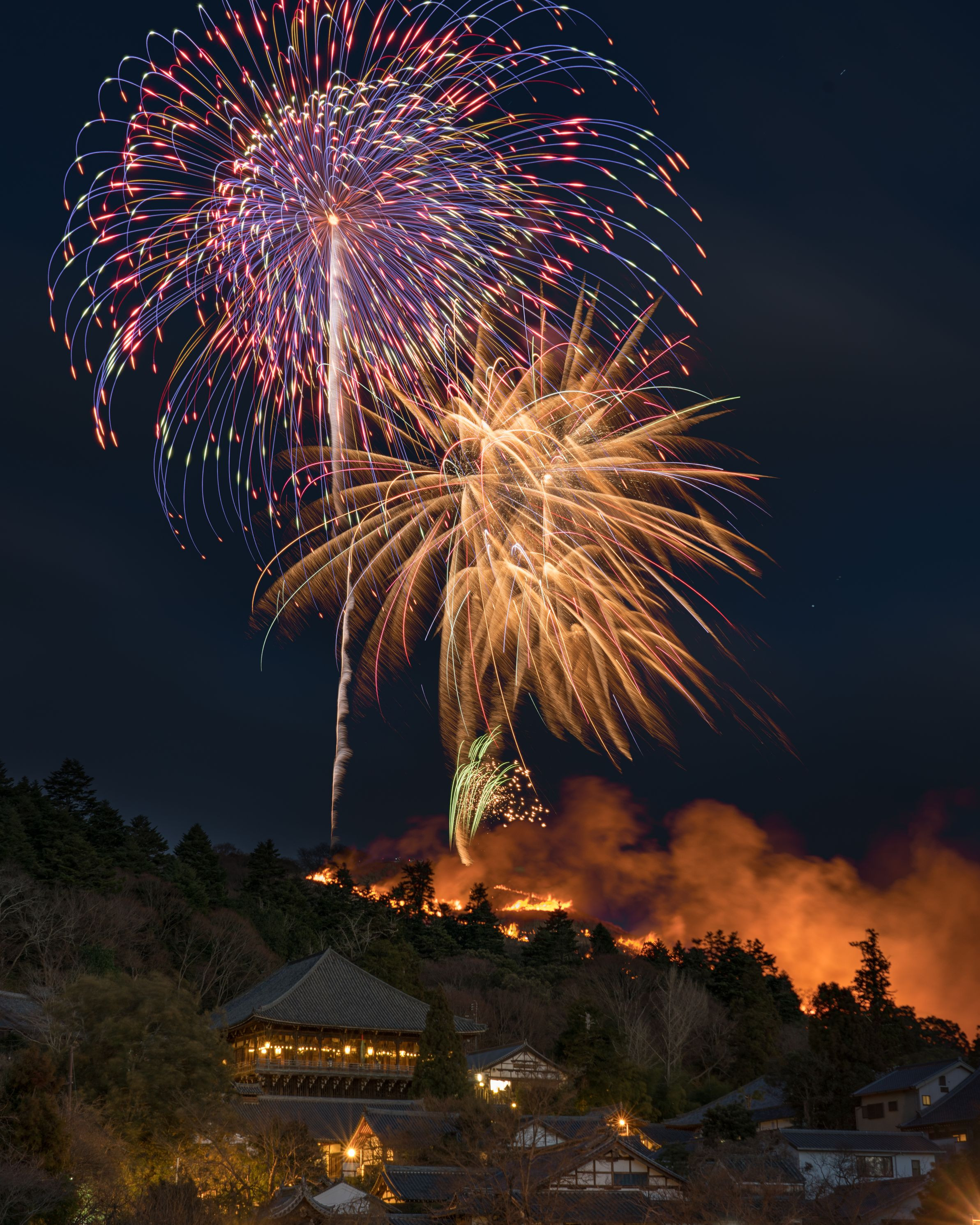 若草山焼き2019 二月堂との合わせ。 ※前景、花火、山焼き別撮りで重ねてます。