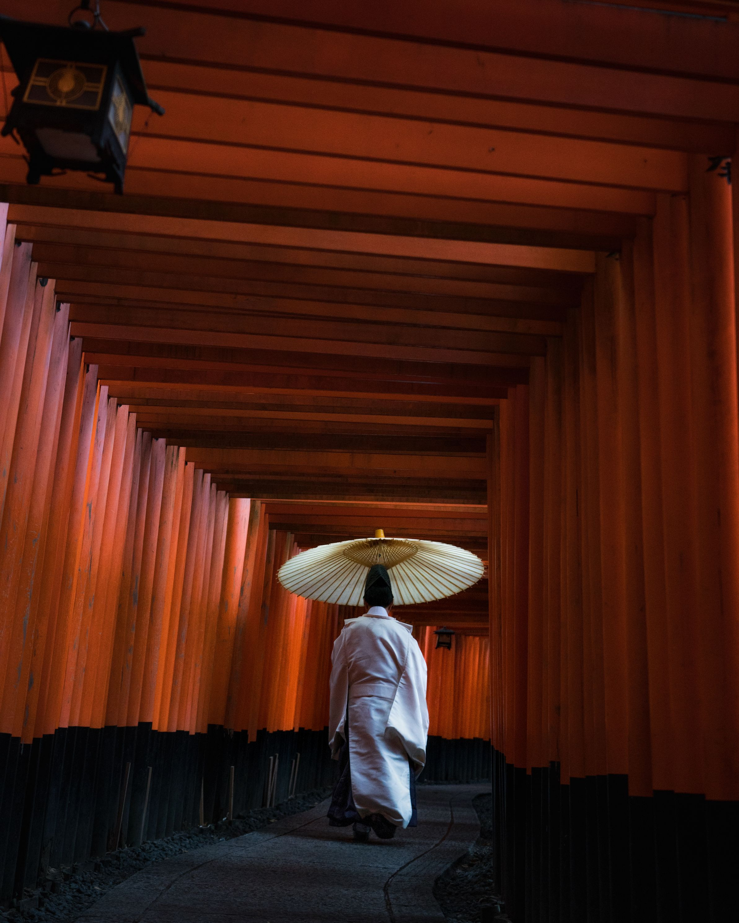 千本鳥居を和傘を指して進む神主さん。 とても神秘的なシーンでした。