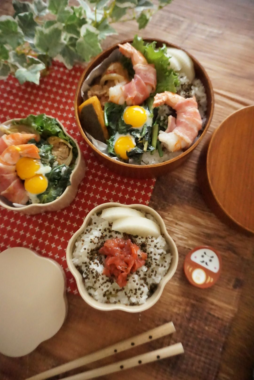 海老のベーコン巻き ほうれん草の巣篭もり卵 ロールキャベツ かぼちゃ煮 お弁当箱選択ミスしたかな💦 上手く詰められず変なバランス