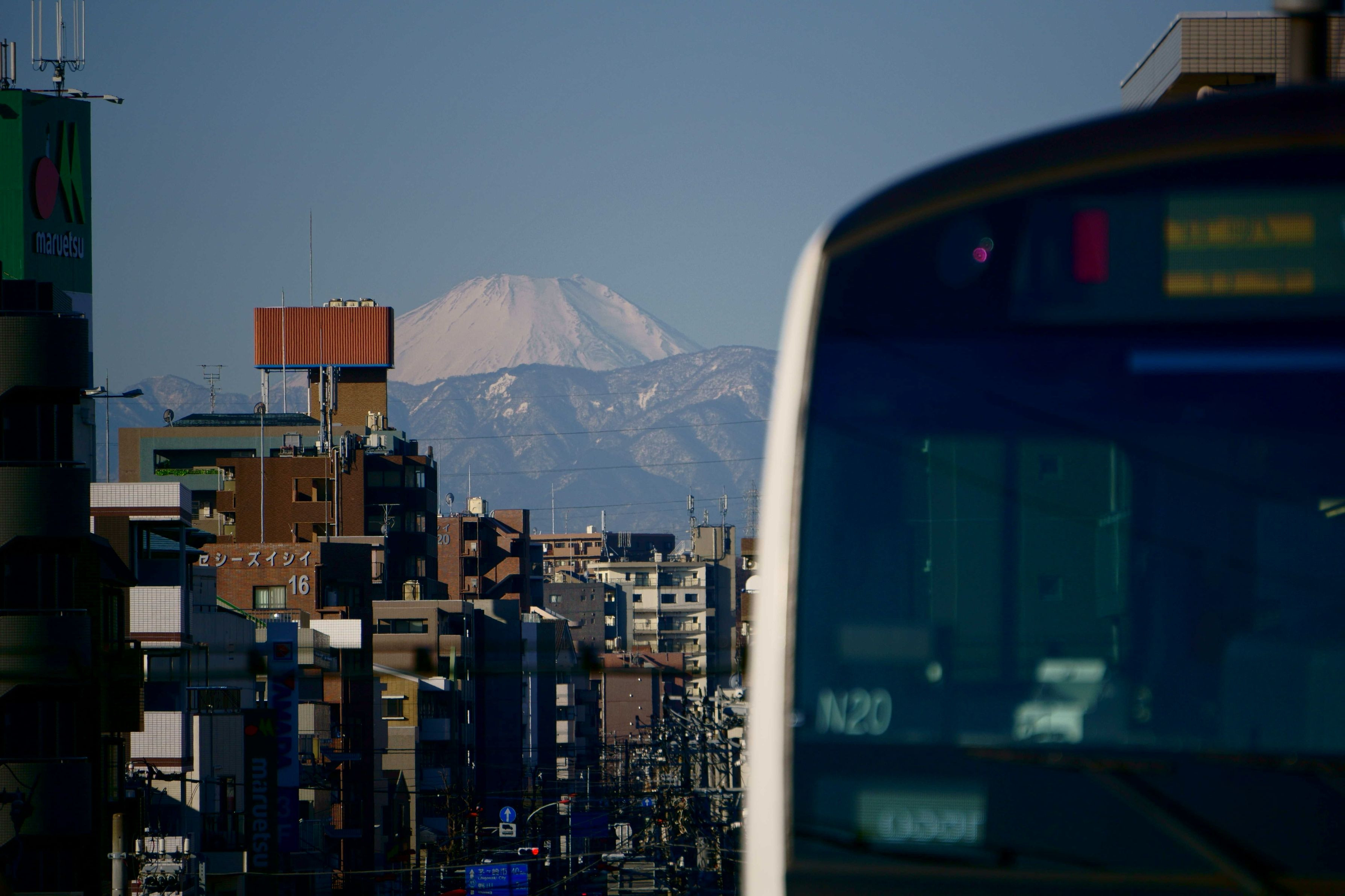 武蔵中原駅のホームの端から見える富士山です。停車中の電車を入れて撮りました。RAW現像でコントラストを上げて、富士山が目立つようにしました。