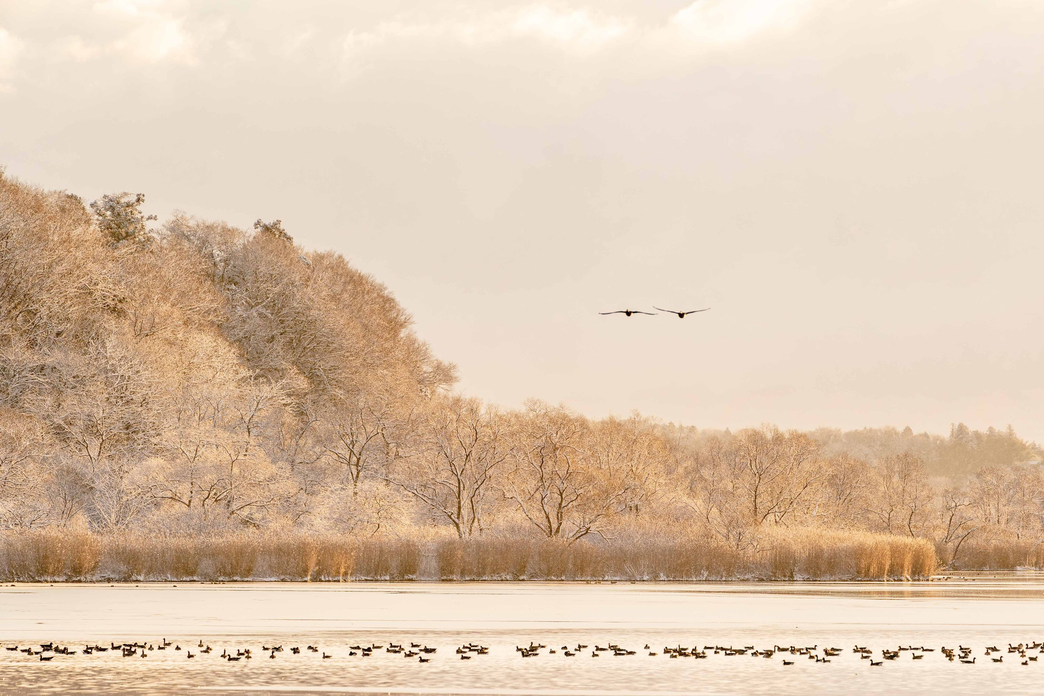 伊豆沼です。 雪が降っているのに朝陽が照っている不思議な朝でした。 雪をかぶった対岸の葦や木立を、朝陽が金色に染め上げる 美しい朝でした。 この日は、マガンはゆっくりと少しずつ飛び立ちました。