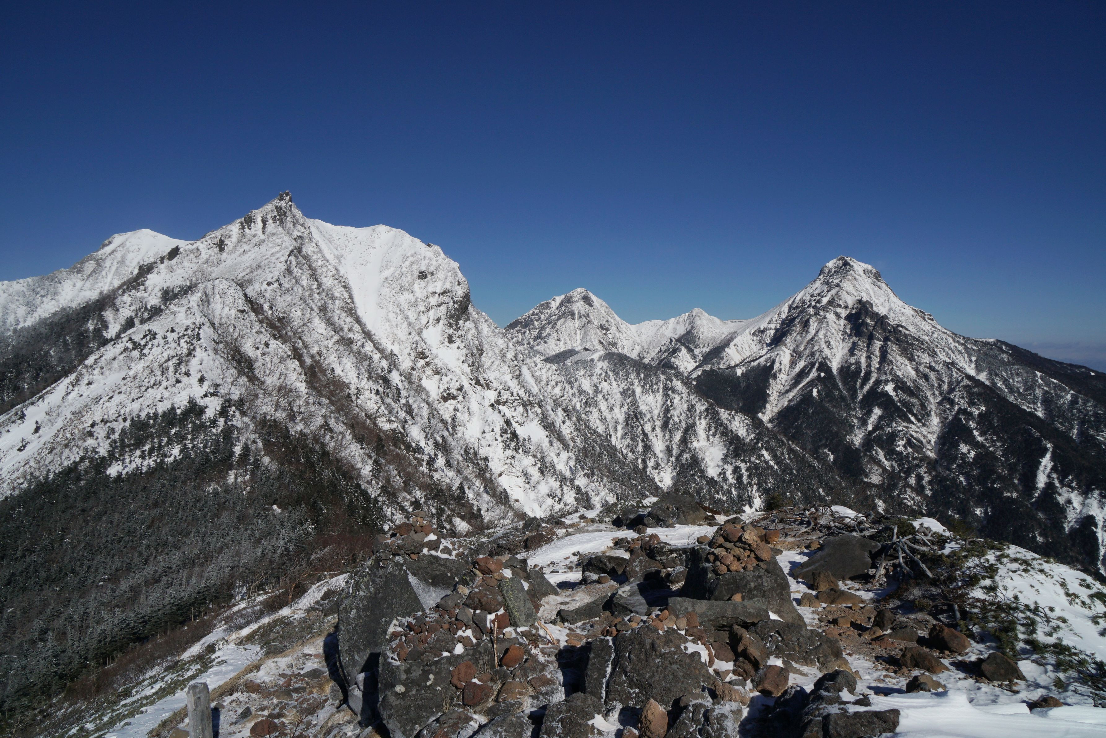 南八ヶ岳随一の展望(個人的に)! 右から赤岳、中岳、阿弥陀岳、権現岳。 今回はノートレースで5時間 目の前の権現岳を諦め下山。 また、来年かなぁ