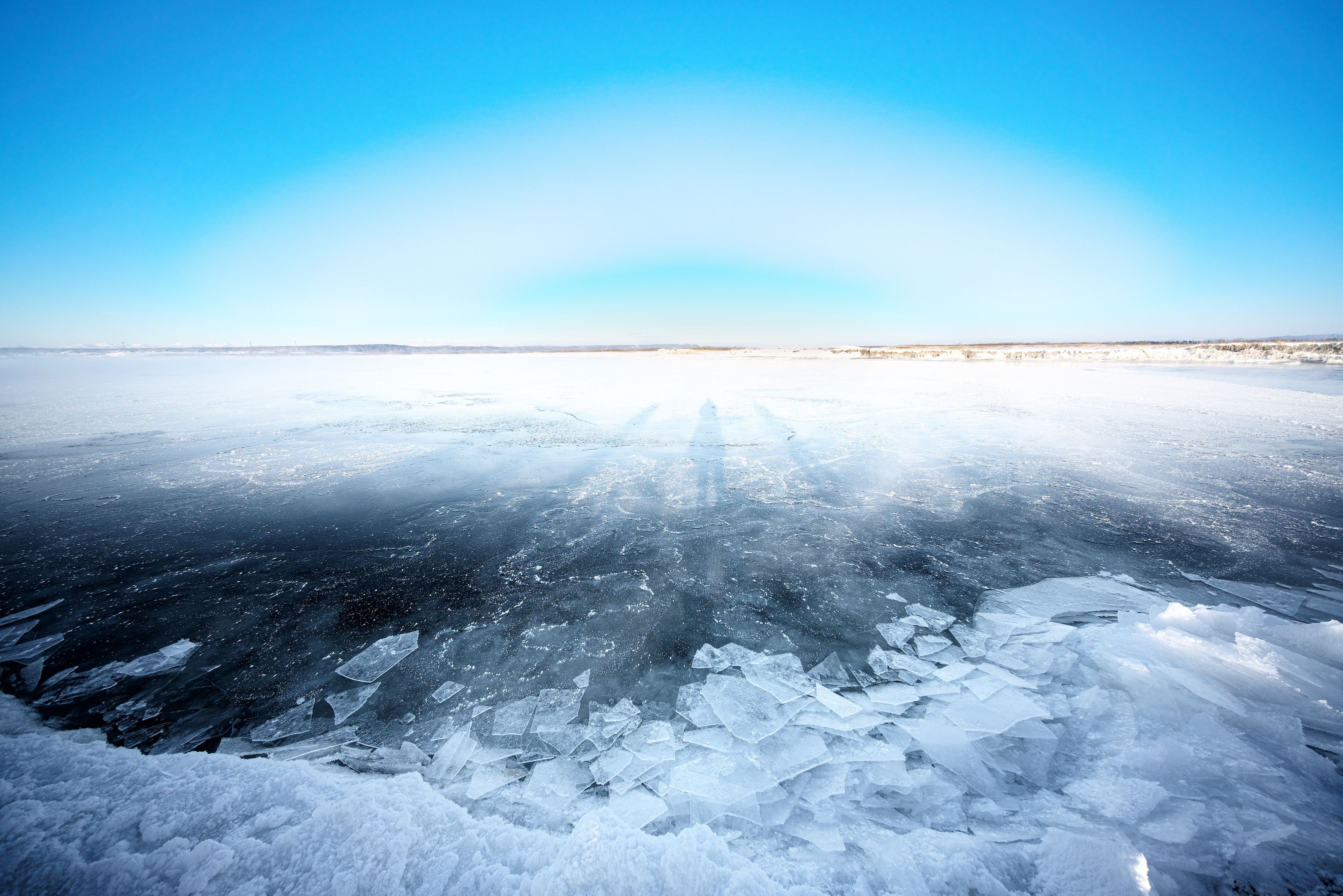 2019/2/10 豊頃町大津海岸 α7RⅢ+Voigtlander HELIAR-HYPER WIDE 10mm F5.6 十勝川から上がる水蒸気が朝陽を反射してアーチ状になったのかな?? 朝陽を背にして立って撮影しているので、自分の影も写ってます。両端は知らない人です。(^^ゞ