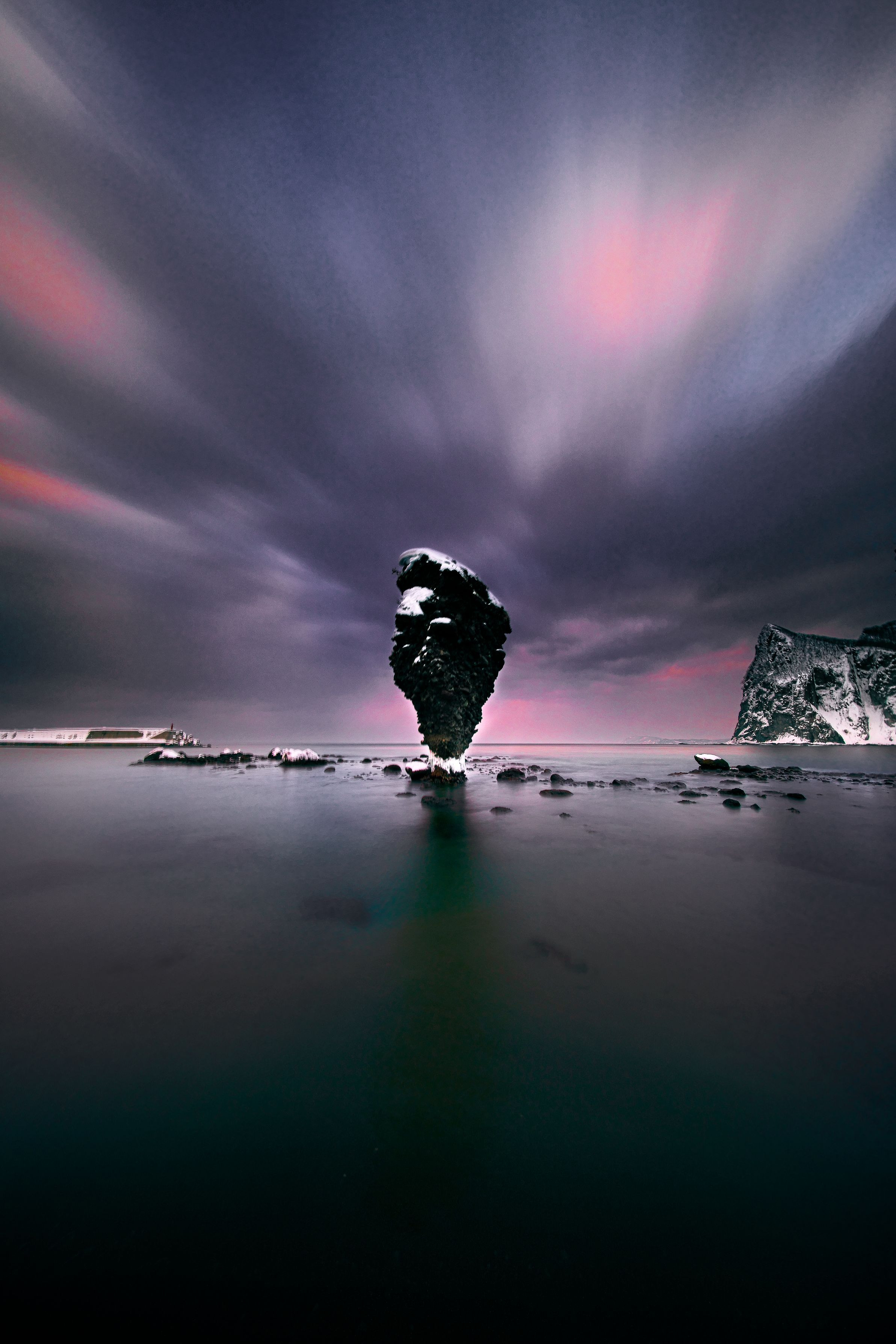 2019/2/17 余市町 α7RⅢ+Voigtlander HELIAR-HYPER WIDE 10mm F5.6+NiSi NANO IR ND1000+NiSi NANO REVERSE IR GND 8 久々のえびす岩。 いい感じで曇っていたので、空に表情を出したくて30秒露光してます。(^^♪ 叫んでるっぽく見えません?