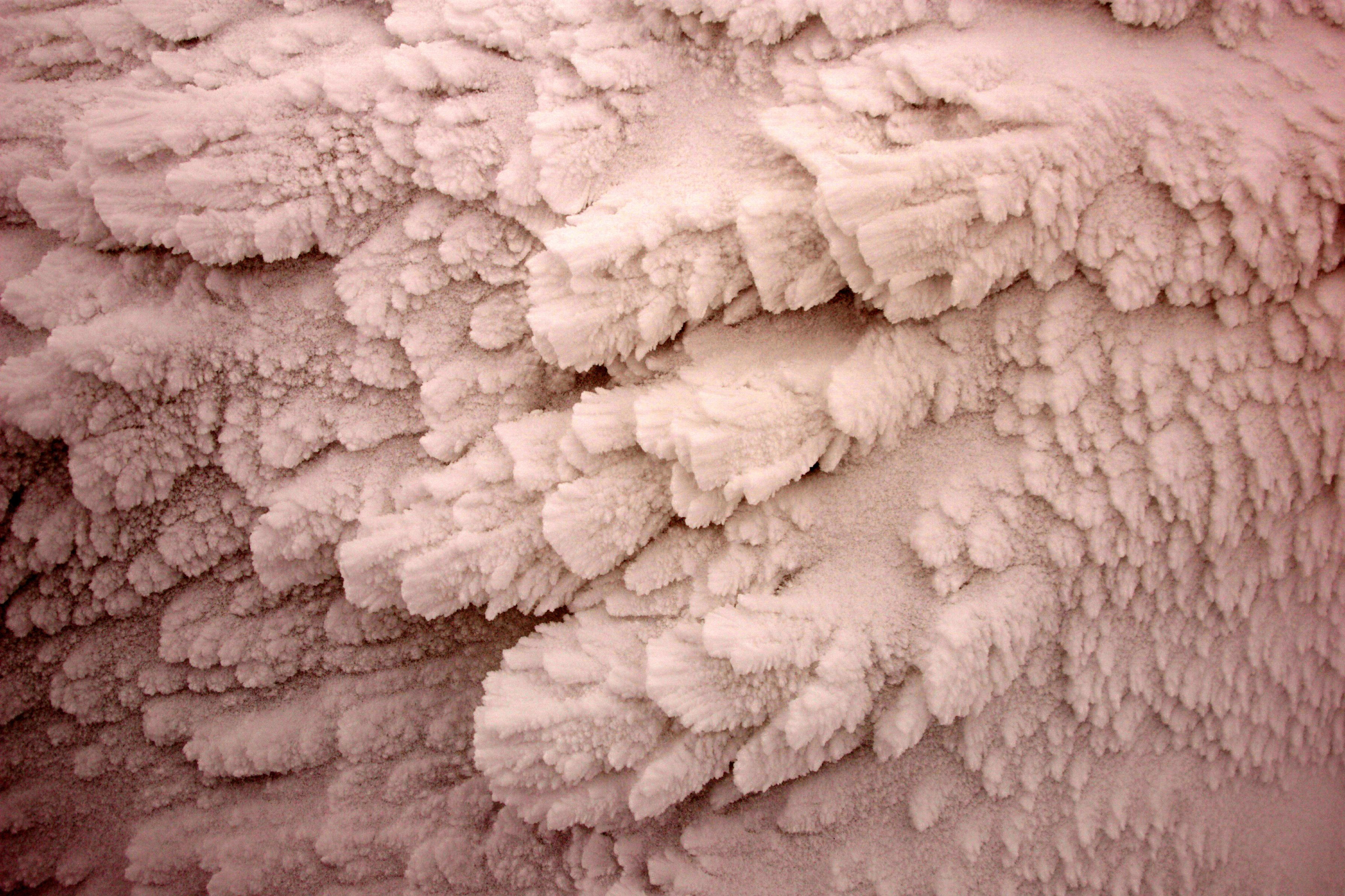 蔵王の樹氷の表面です。風で雪が吹き付けられ、エビの尻尾のような形になります。