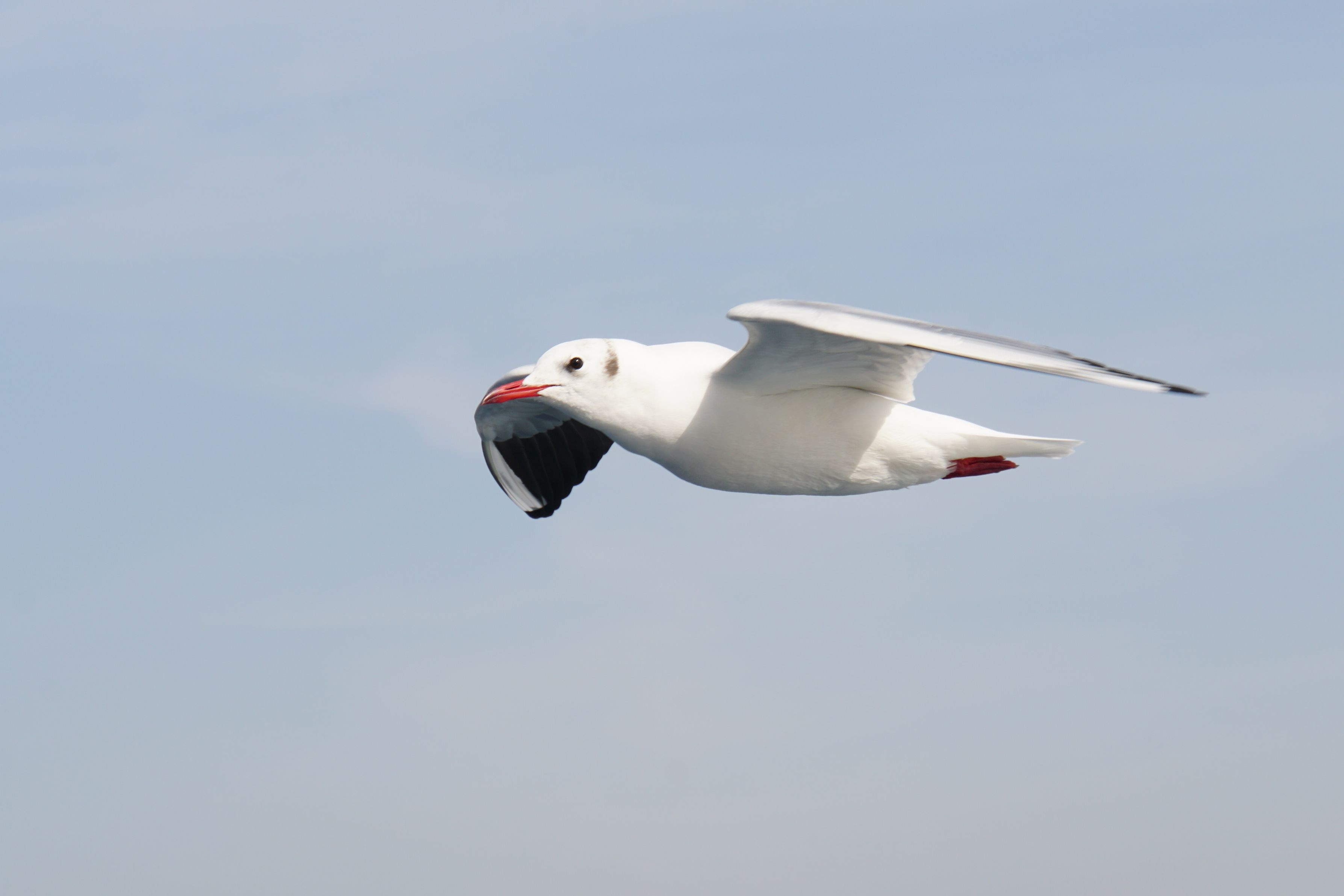 カモメが飛ぶ姿をやっと切り取れました。まさに飛ぶための機能にあふれた姿です。足を見てください。羽の形を見てください。頭の形を見てください。素晴らしい機能美に包まれています。鳥ってかっこいいですね!