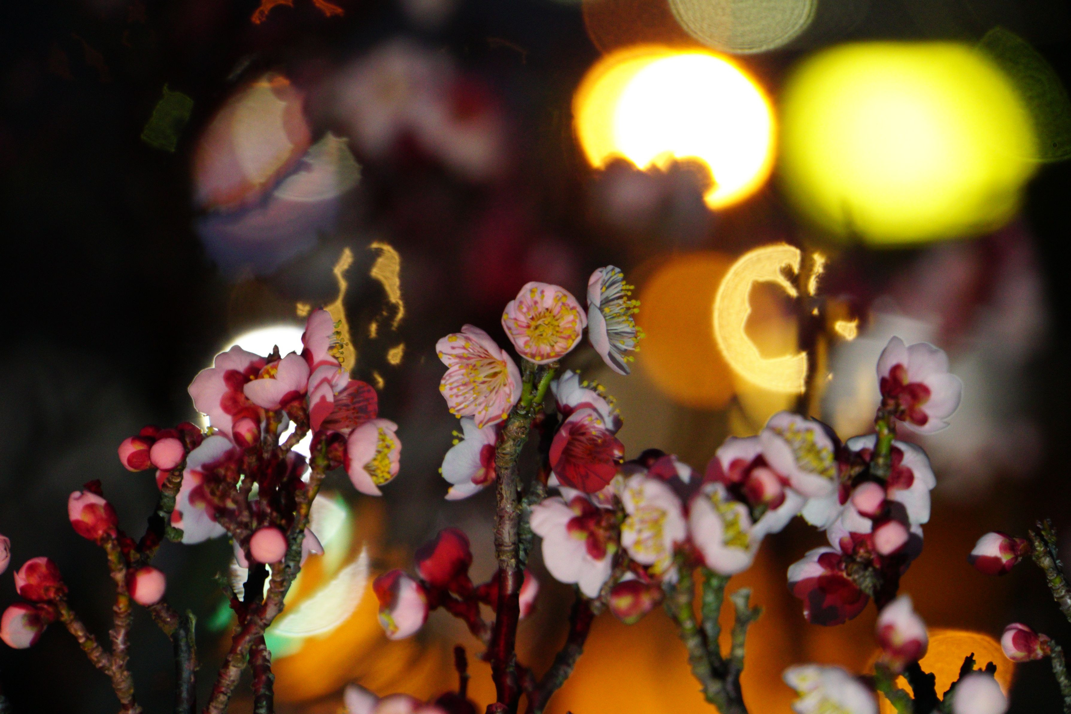 なんだろう、夜桜はあるけど、夜梅って。 日没も早いし、日中の方が良いのだろうけど、夜の梅の楽しみ方。 ライトを用意して、光を当てながら、バックの光を撮影する。綺麗かも、なーんてね。