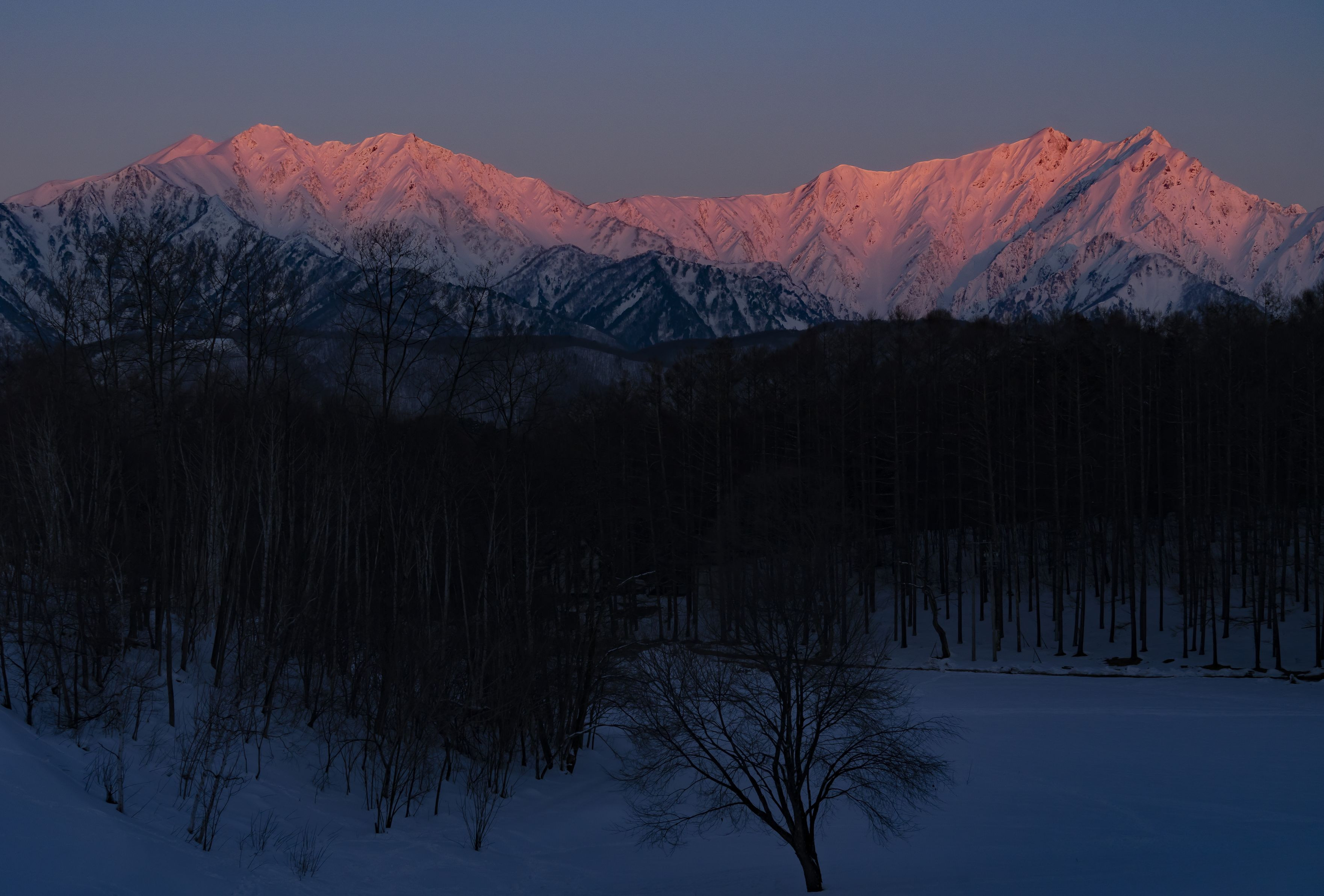 冬の朝、雪山が赤く染まる僅かな時間を切り取りました。