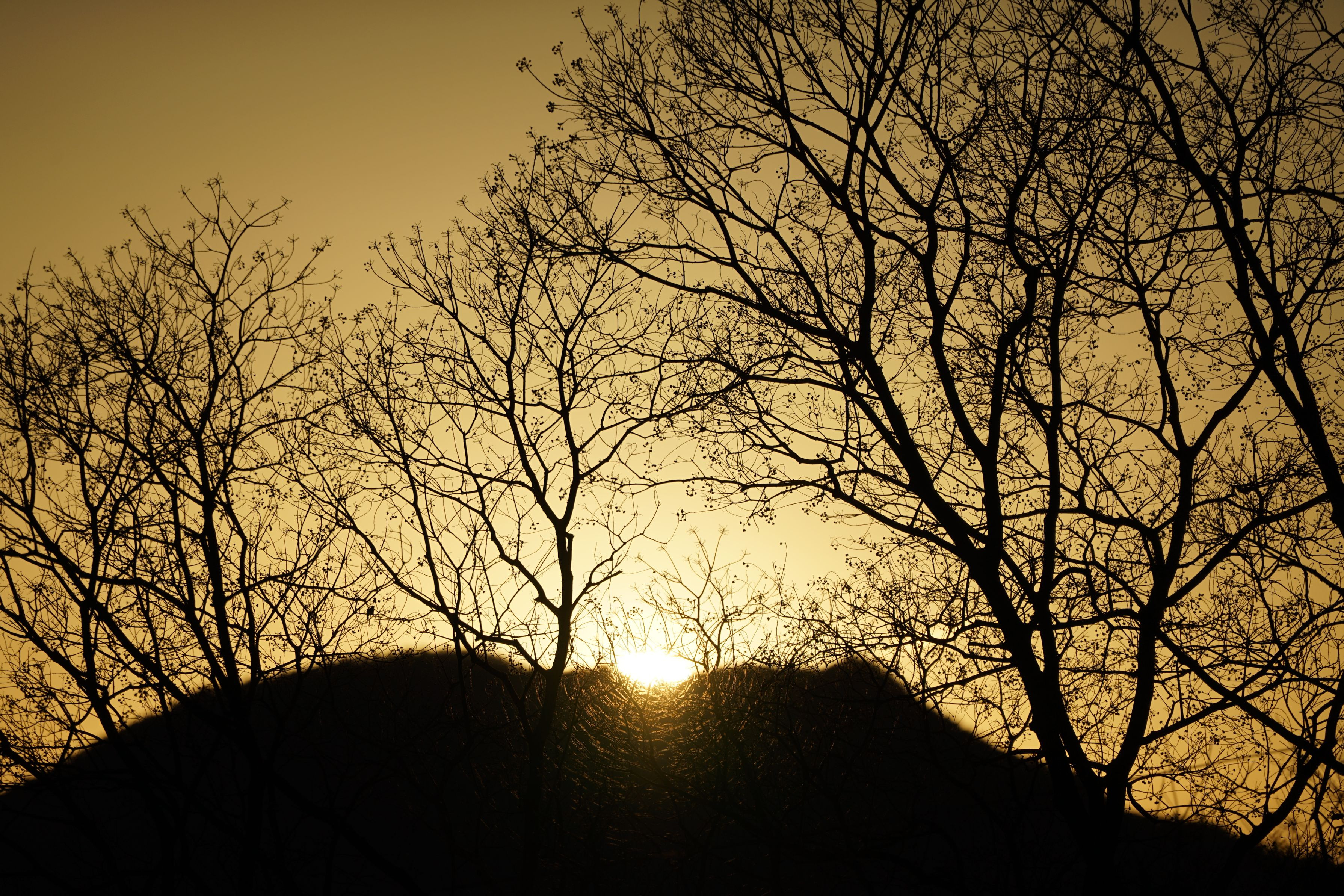 山に沈む夕陽が綺麗でしたので、樹木を入れて見ました。