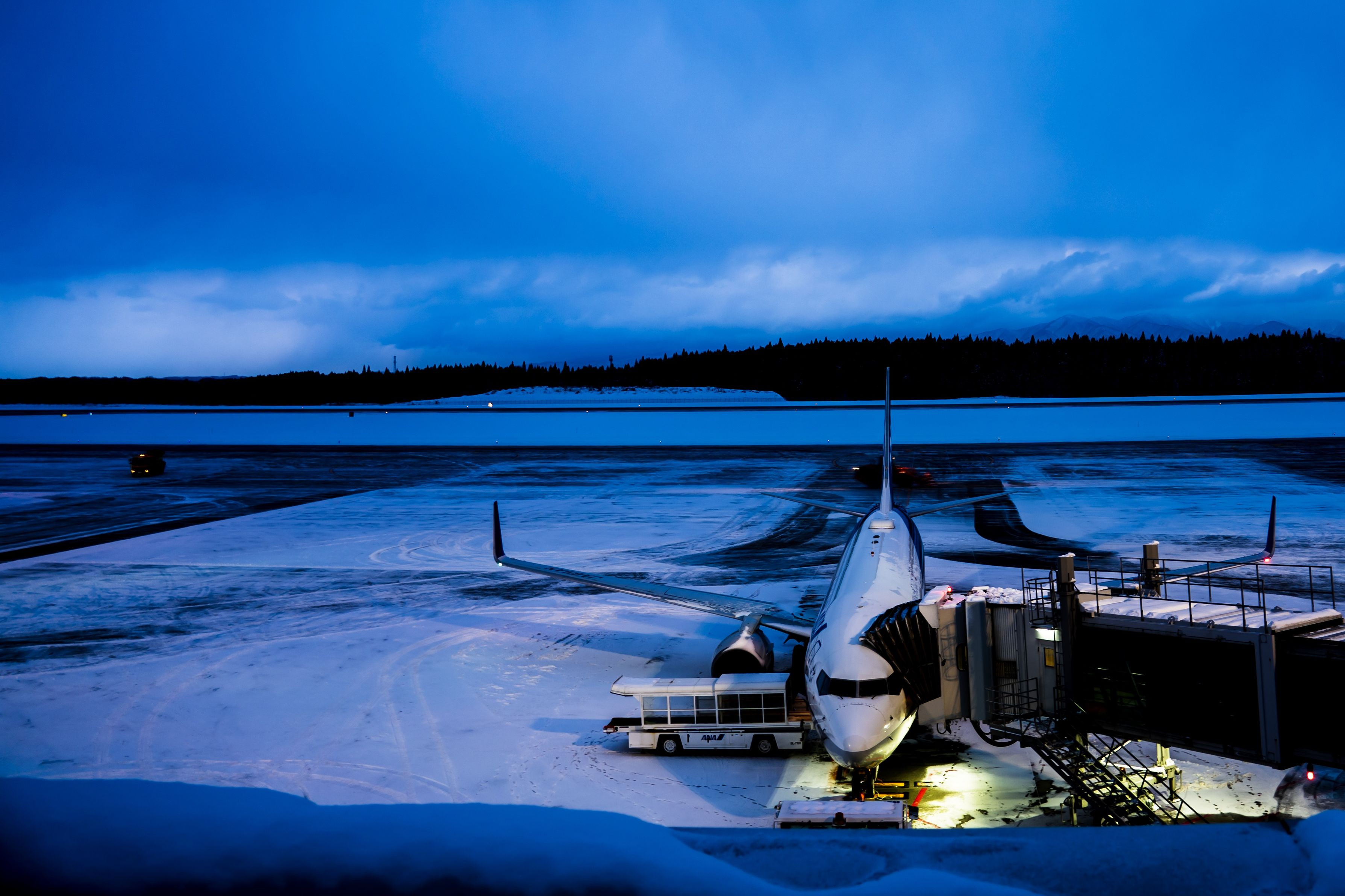 早朝の秋田空港。青くなり始めた空と出発準備中のB737を照らす光が印象的。